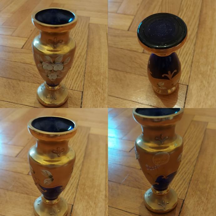 Vaza kobalt-staklo, plavo-zlatne boje, sa ručno rađenim cvijetovima, marke Bohemia, proizvodnja Čehoslovačka.
