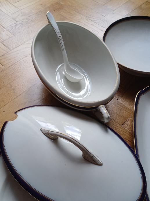 Porculanski set za posluživanje, Čehoslovačka, oznska EPIAG Pirken Hammer, oko 1925-1930. Dva okrugla pladnja, jedana duboka posuda, jedan pravokutni veliki pladanj, jedna posuda za juhu s poklopcem i žlicom, posudica za sol, dvije manje posude za umak s poklopceima, jedan ima žlicu. Uščuvano, na jušniku popravljena ručka.