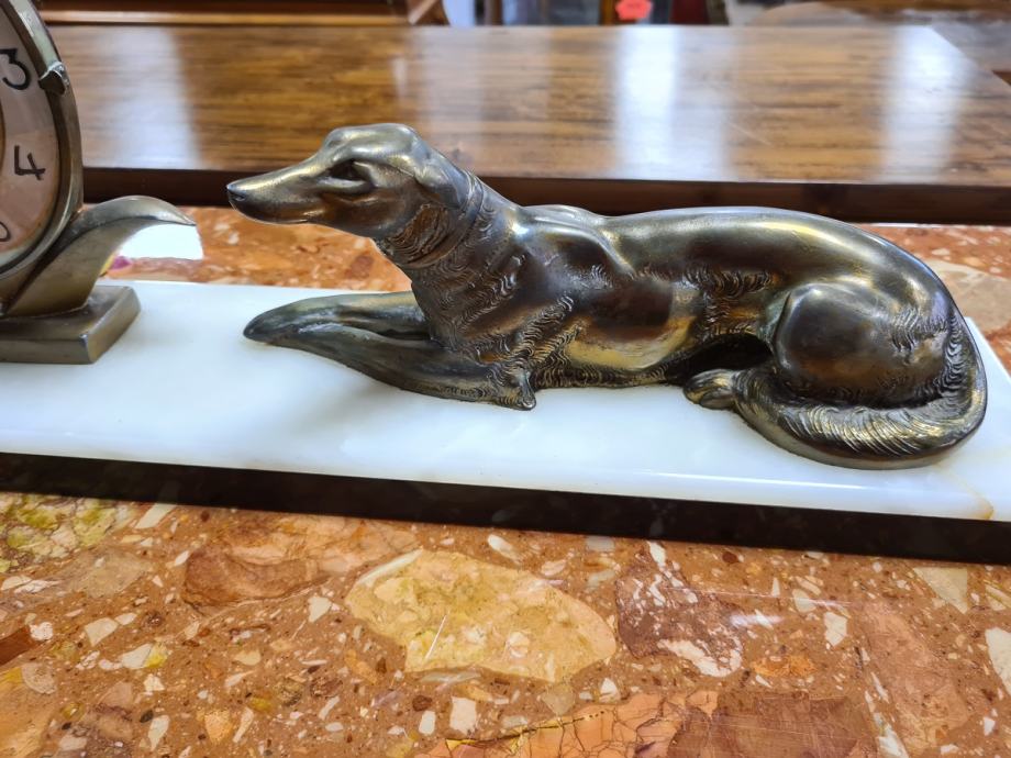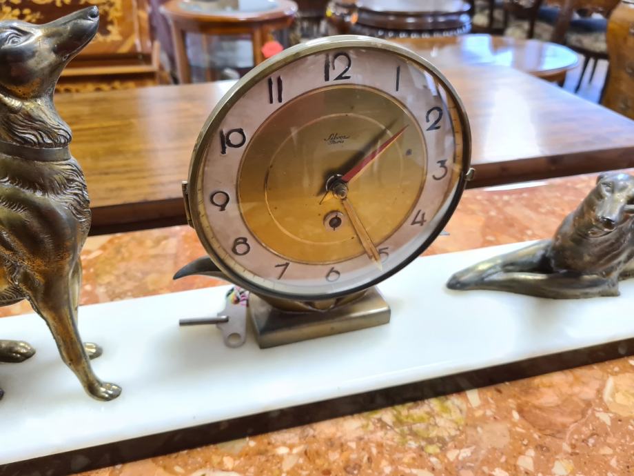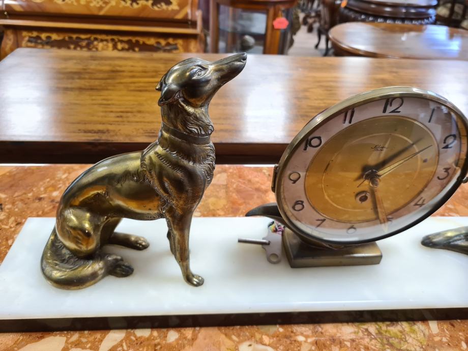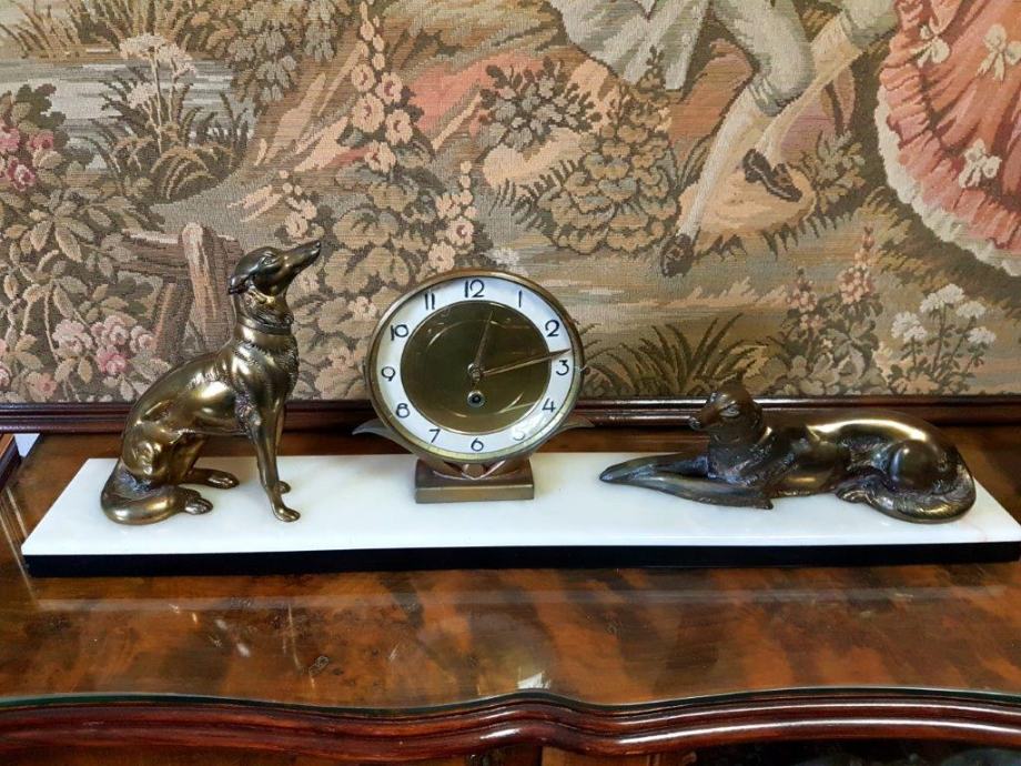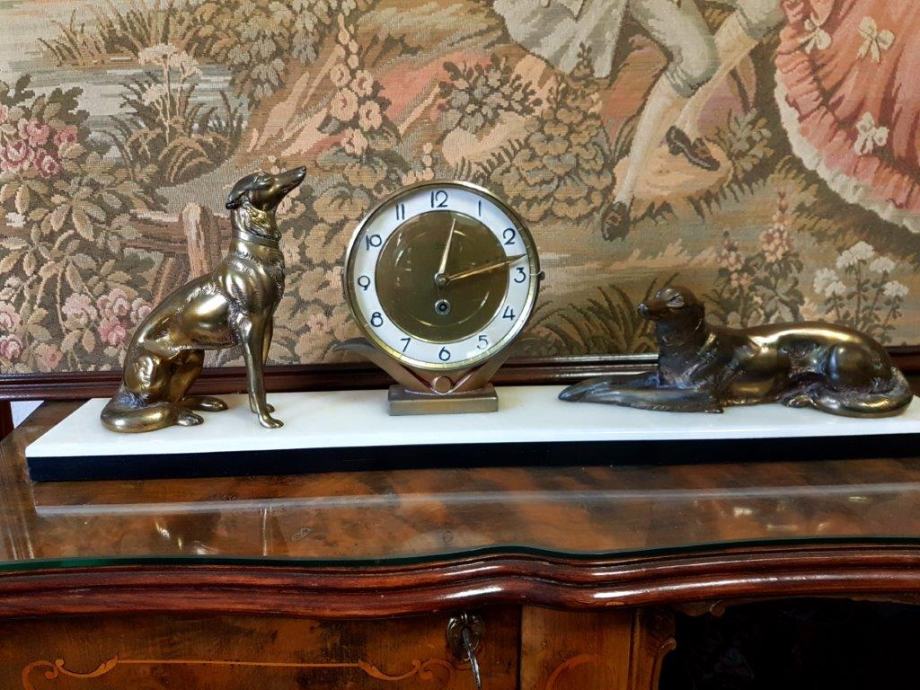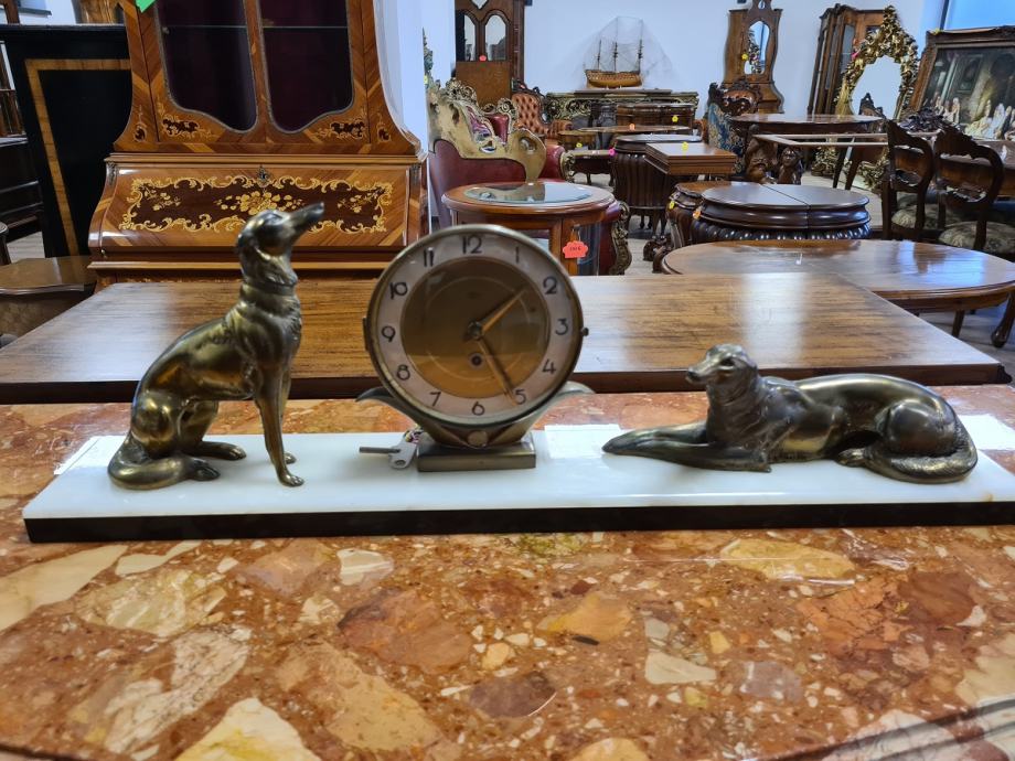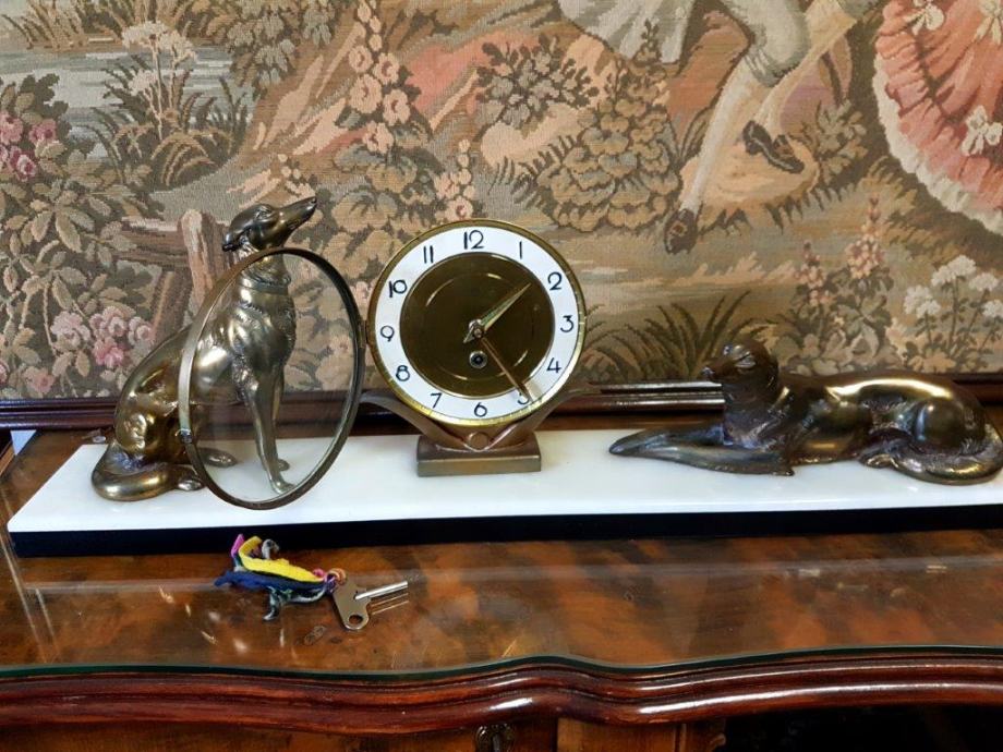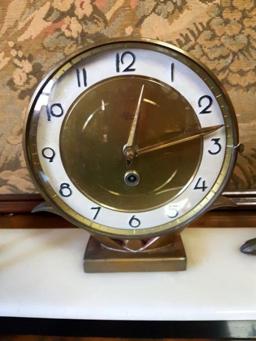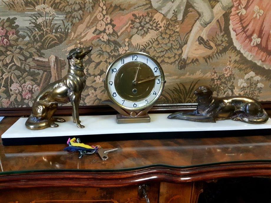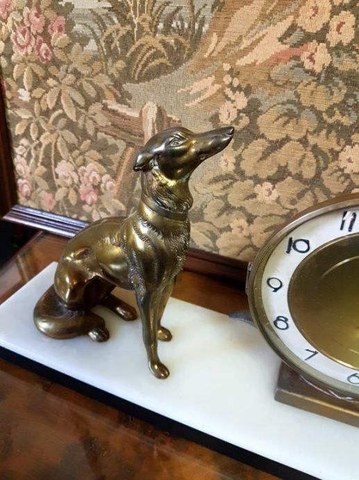 Komodni mramorni sat s predivnim mesing figurama, ispravan, 75cm dužine.