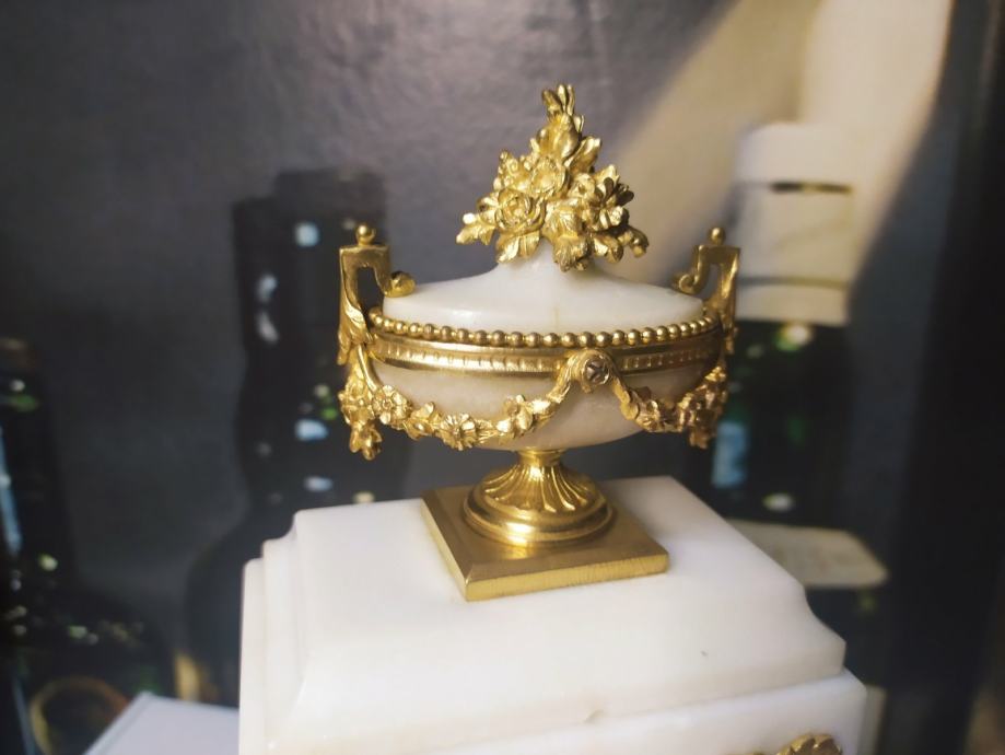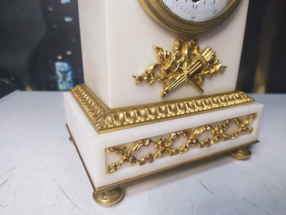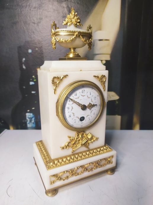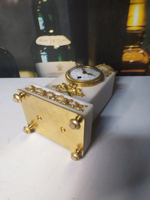 Francuski komodni sat cca 1890g u stilu Luj 16 mini verzija dim.31x14x10 bjeli mramor i bronca pozlata.mehanizam sa nemirnicom ispravan