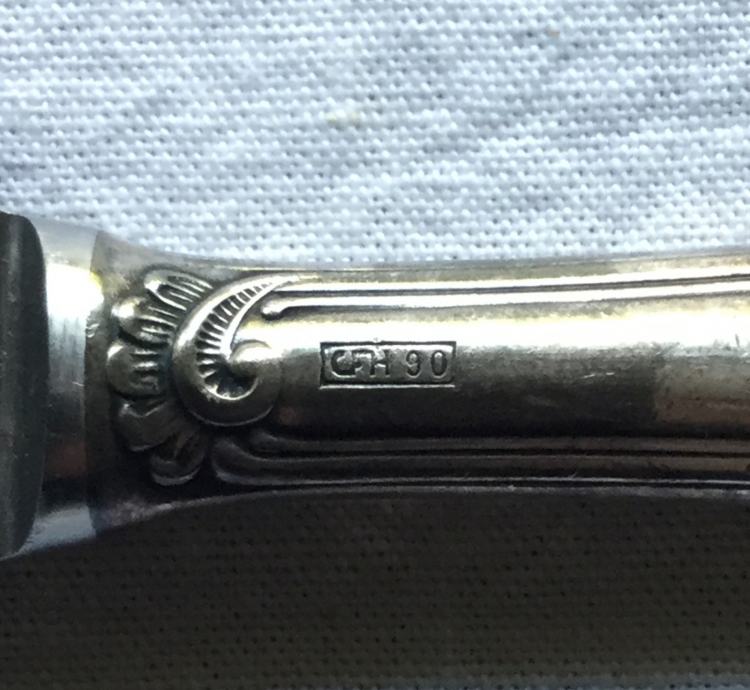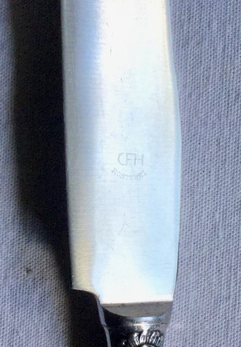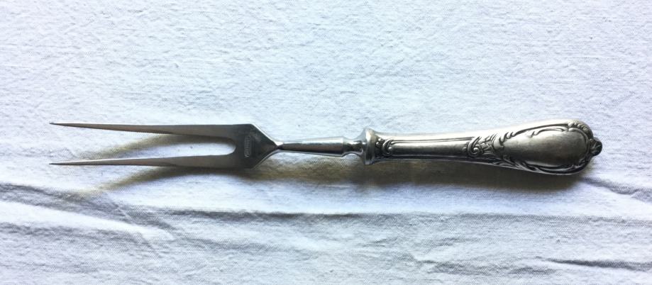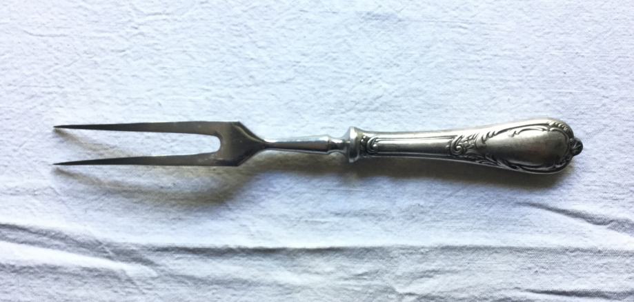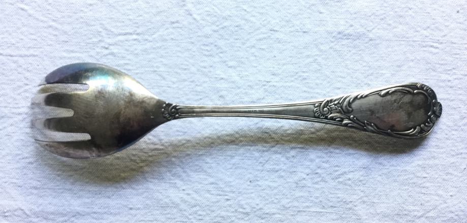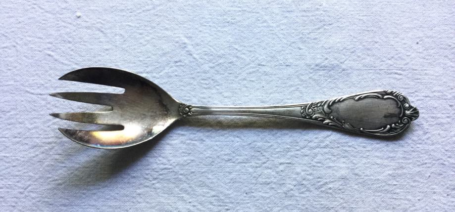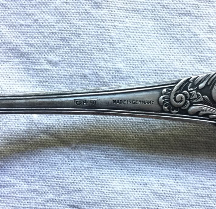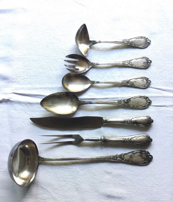 Prekrasan starinski (Jugendstil) posrebreni komplet pribor za serviranje hrane koji se sastoji od 7 komada, oznaka CFH 90, MADE IN GERMANY u odličnom stanju.