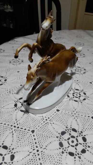 Konji od porculana bez oštećenja. Proizvođač Carl Scheidig iz Grafenthala, Njemačka. Tvornica osnovana 1906 godine. Isti su stari preko 80 godina i usčuvani. Cijena može I po dogovoru