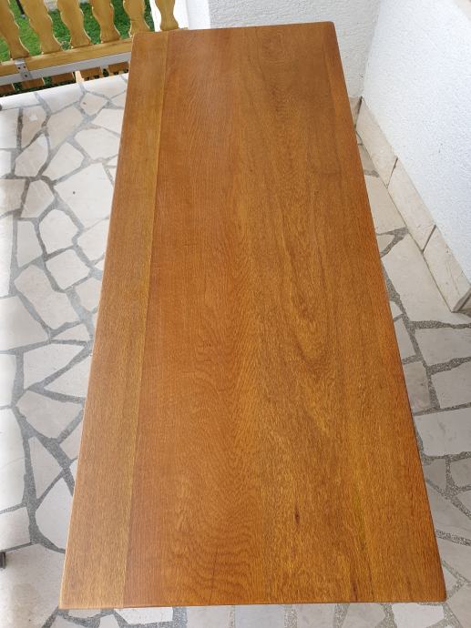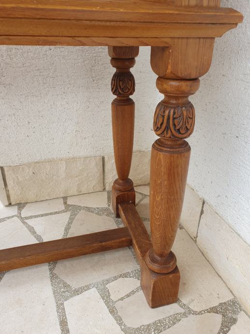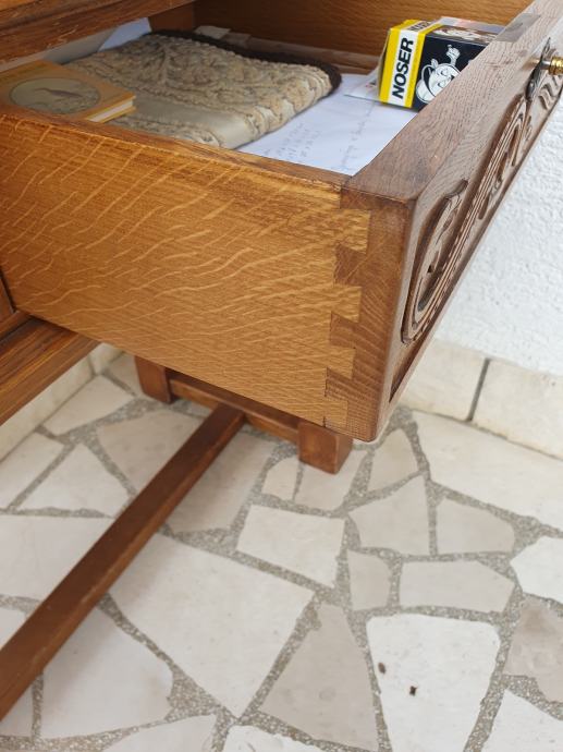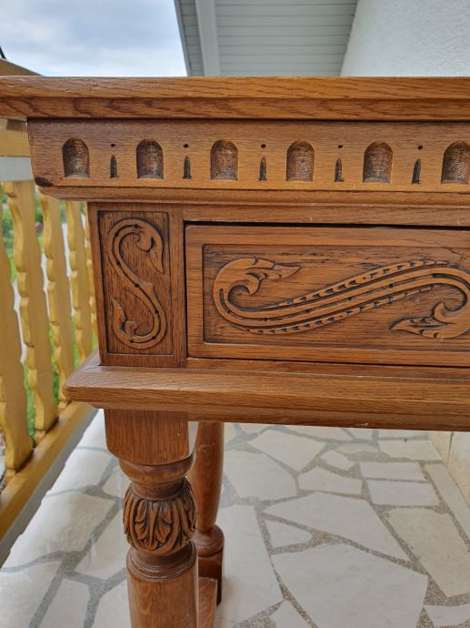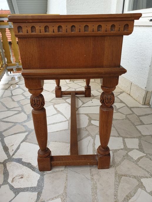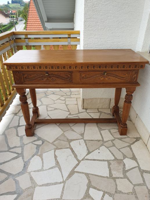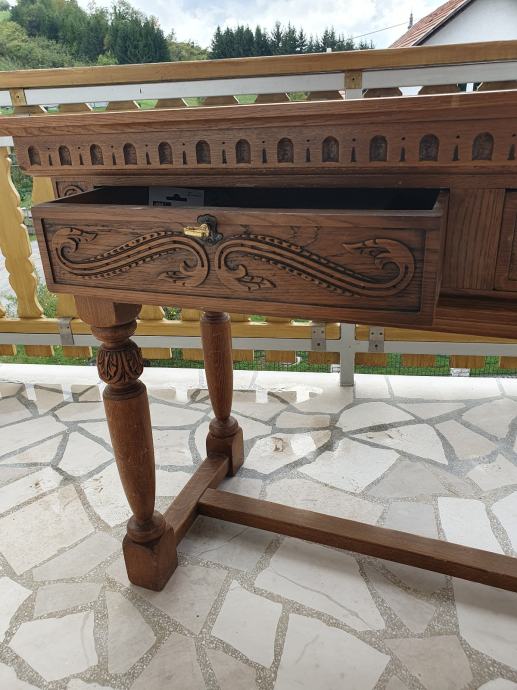 Konzola iz Hrastoog drveta,čitava masivno drvo,djelonice rezbarena vrlo precizni rad.2 ladice sa mesing bravama i duplim ključevina,uporaba prema želji vlasnika.Stabilan i čvrsti namjestaj u izvrsnom stanju ,restaurirano. Idealno za hodnik ili dnevni boravak.