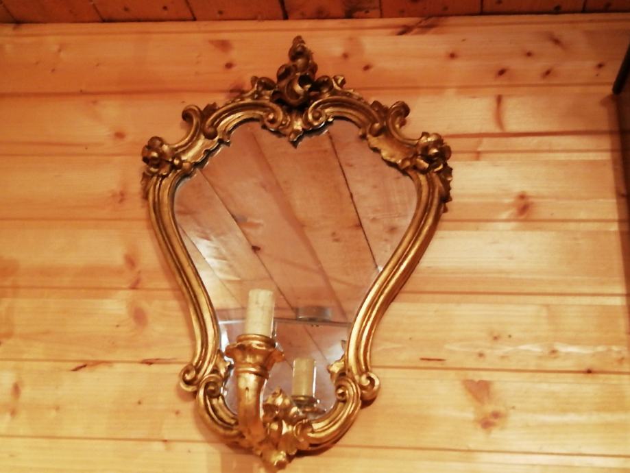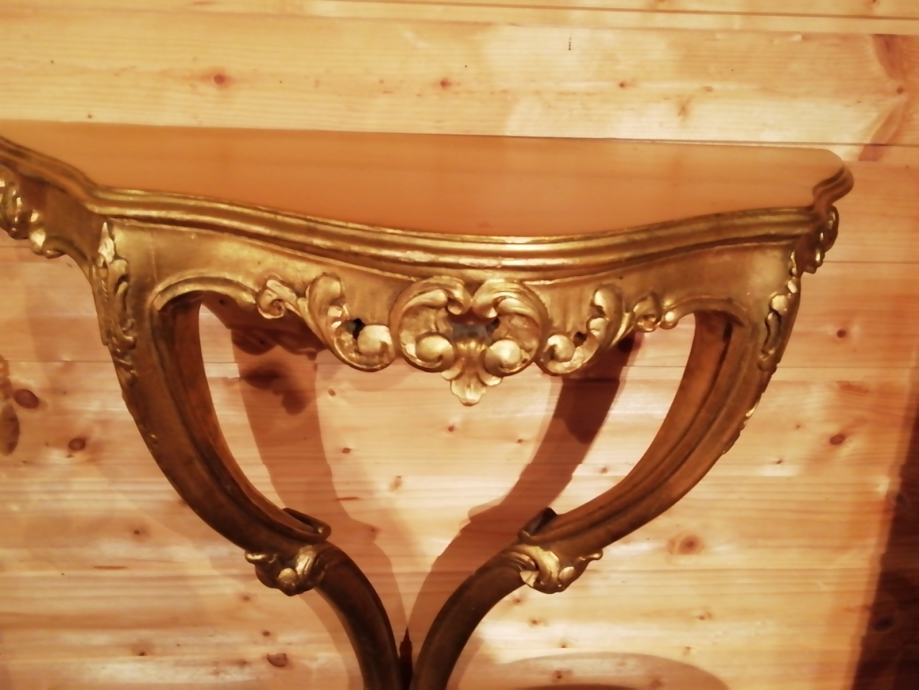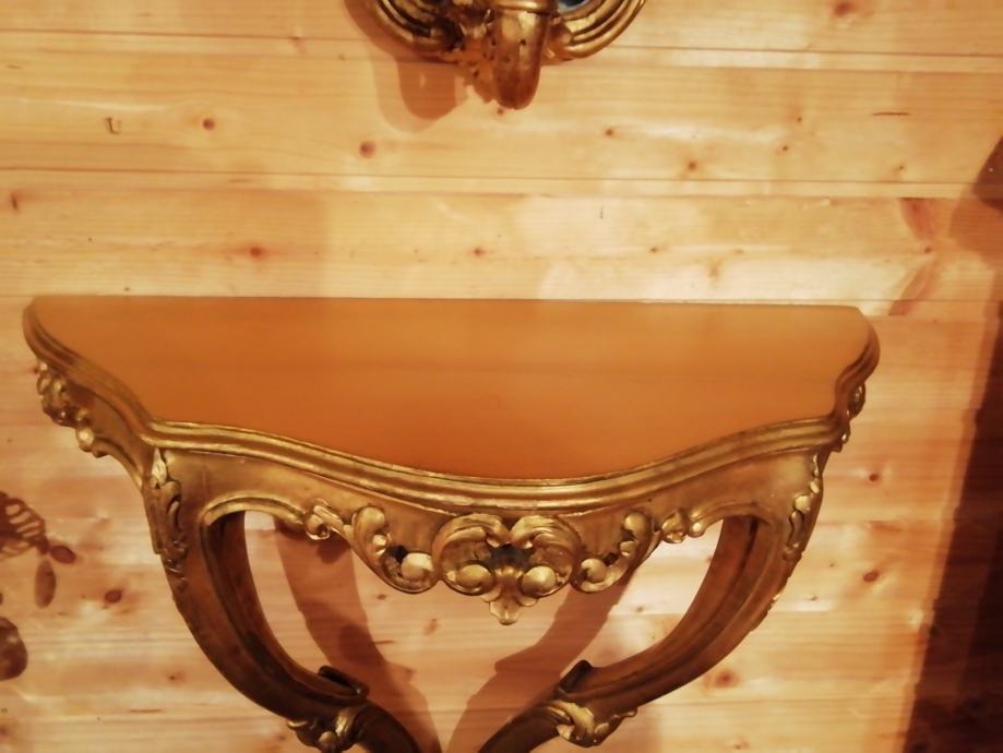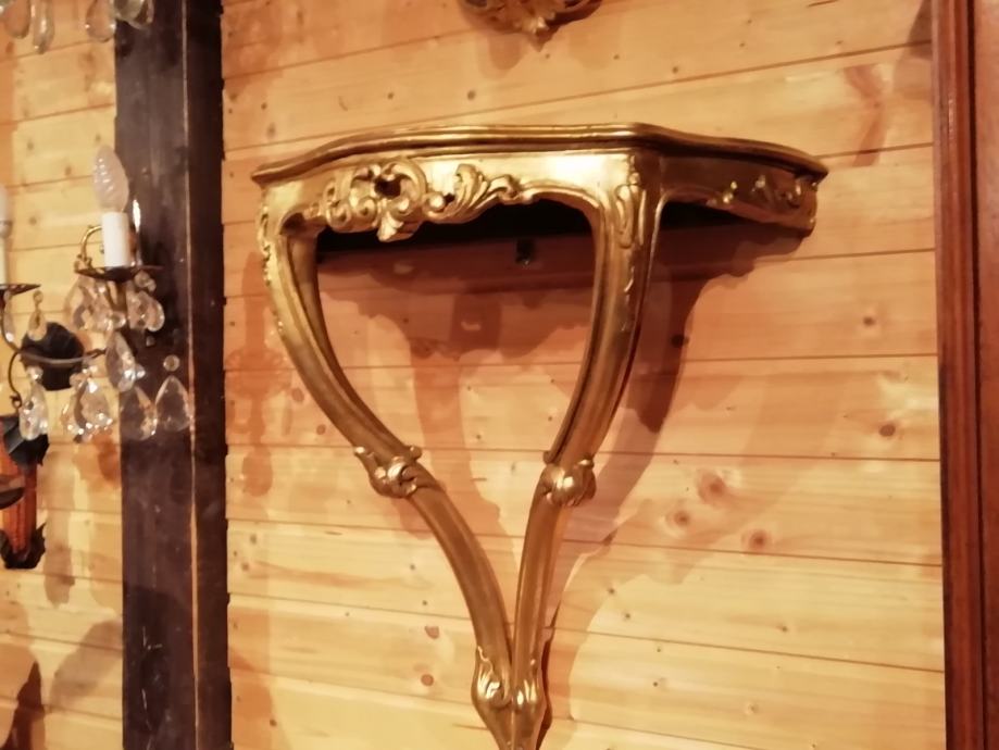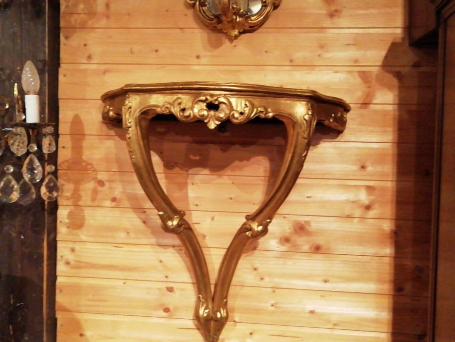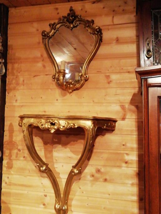 Pozlacena i rezbarena drvena konzola sa ogledalom. Na ogledalu se nalazi lampica. Konzola duzine 60 cm visina 60 cm i dubina 28 cm. Ogledalo visina 55 cm, sirina 40 cm.