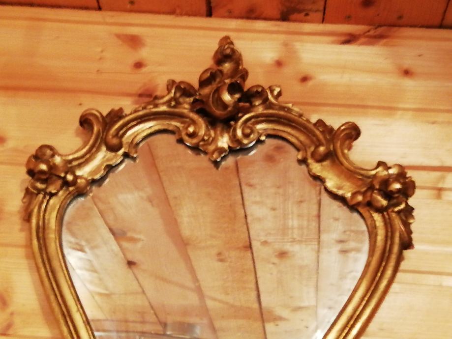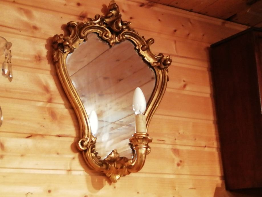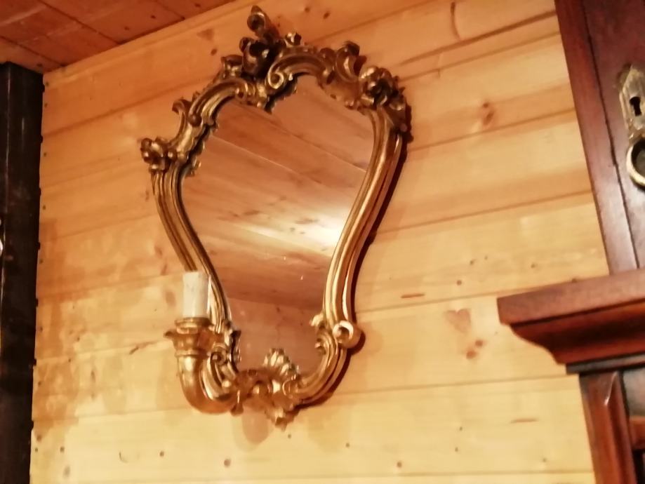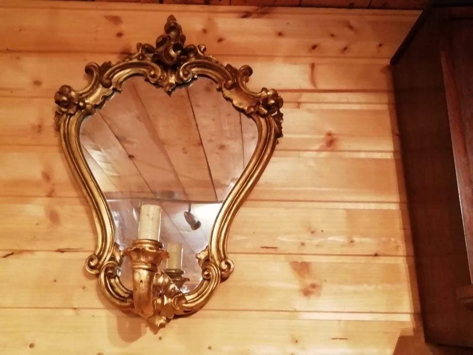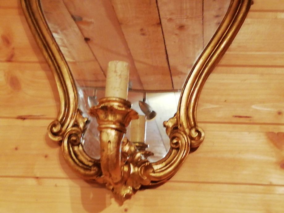 Pozlacena i rezbarena drvena konzola sa ogledalom. Na ogledalu se nalazi lampica. Konzola duzine 60 cm visina 60 cm i dubina 28 cm. Ogledalo visina 55 cm, sirina 40 cm.
