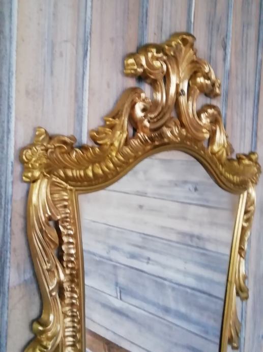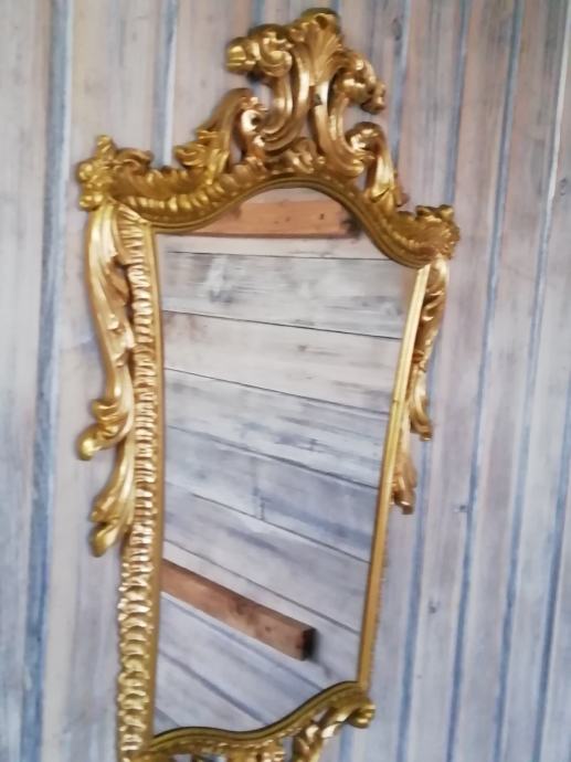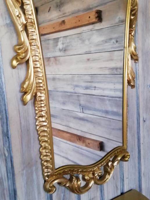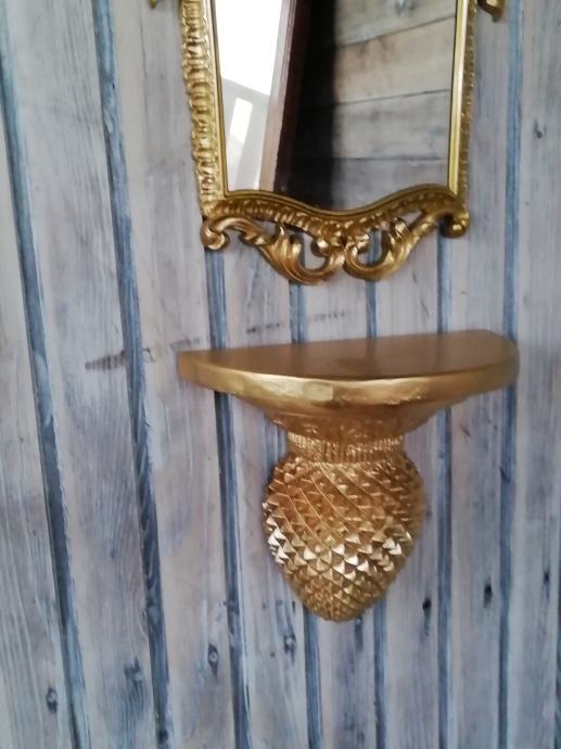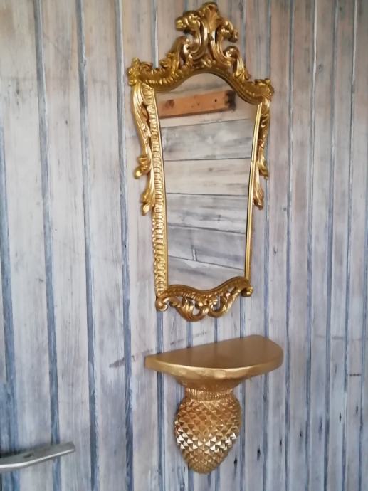 Pozlacena manja konzola i ogledalo. Ogledalo visine 55 cm, sirina 32 cm, ; konzola visine 23 cm, sirine 26 cm i dubina 14 cm. Pogledajte i ostale nase oglase.