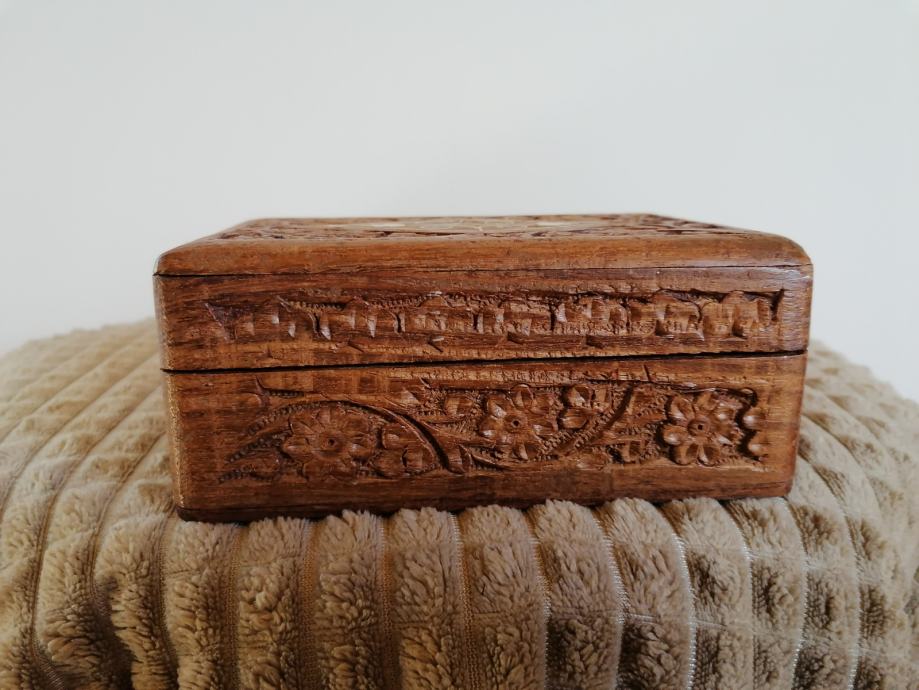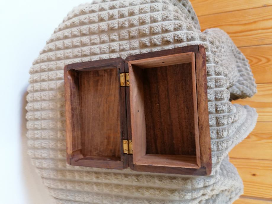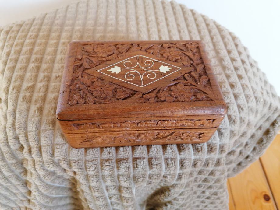 Drvena rezbarena kutija sa aplikacijama od sedefa. Top stanje. Dimenzije 15x10x7 cm. Dobijete predmet sa slika.