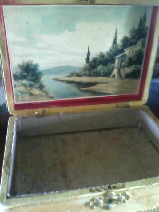 prekrasna kutija vrlo stara s srebrnim ornamentima i s orginal slikom u njoj .potrebno obnoviti