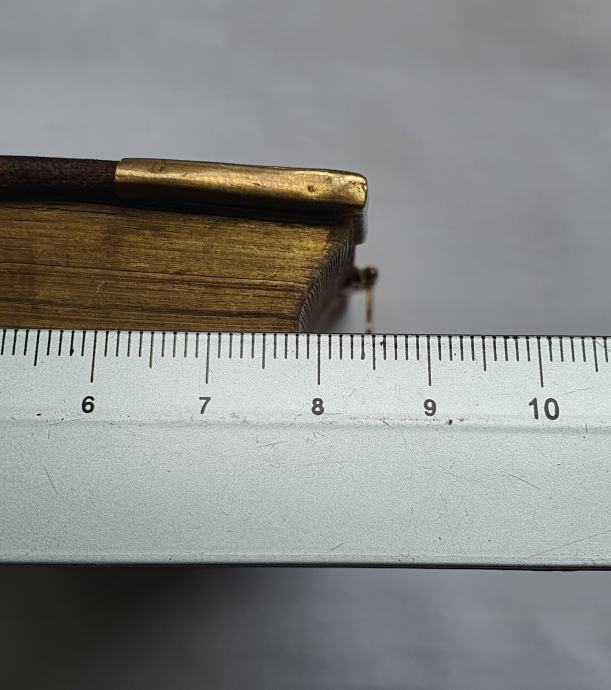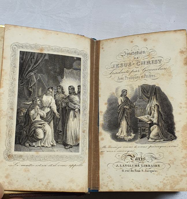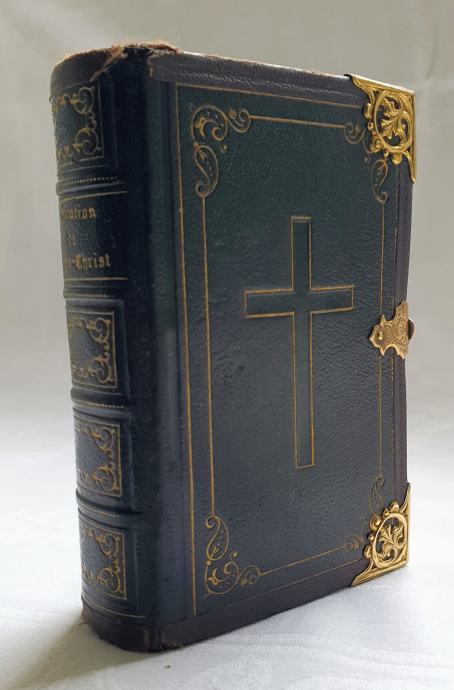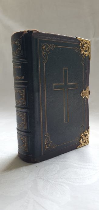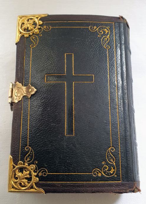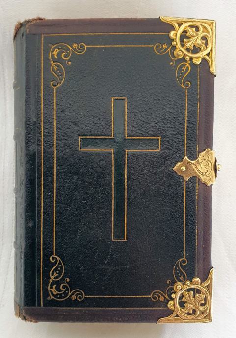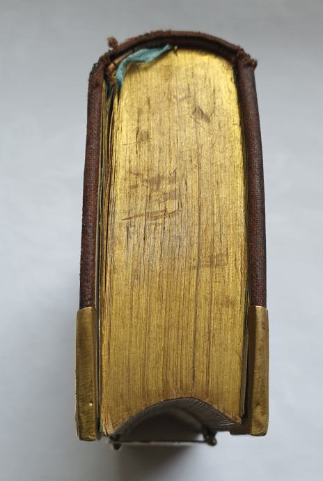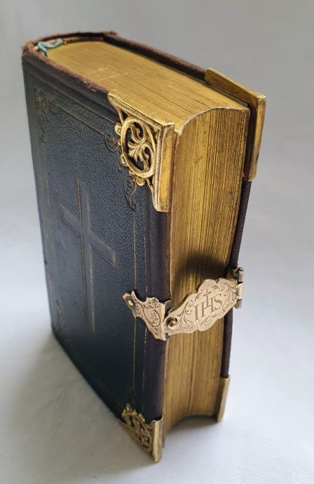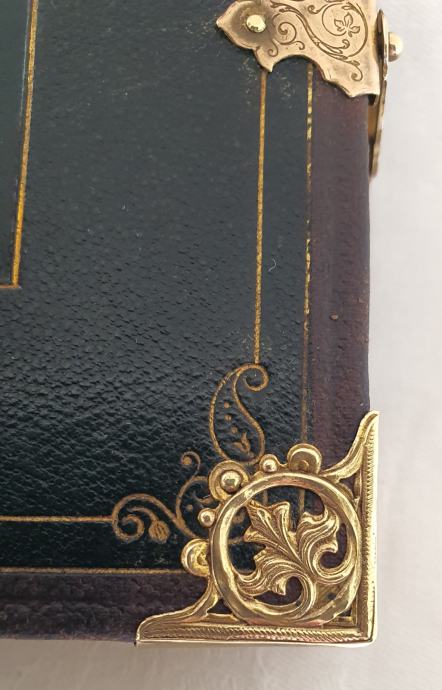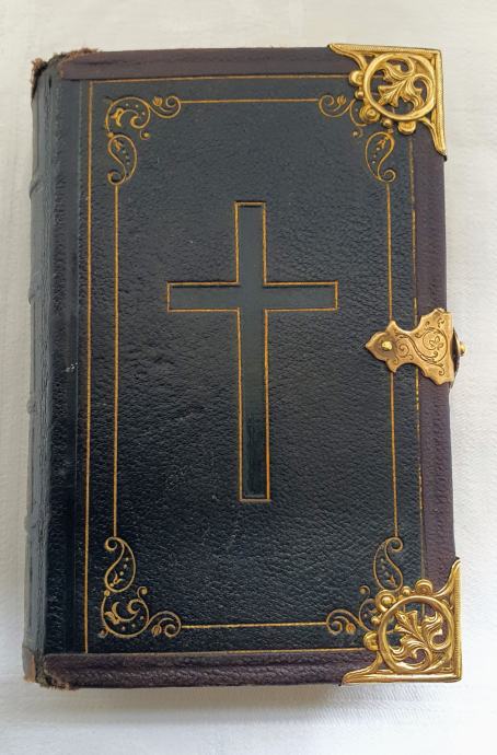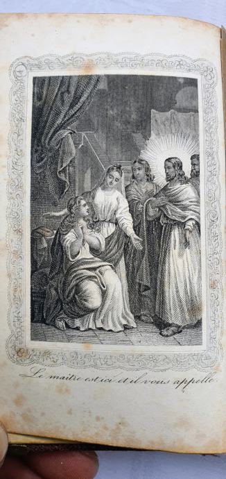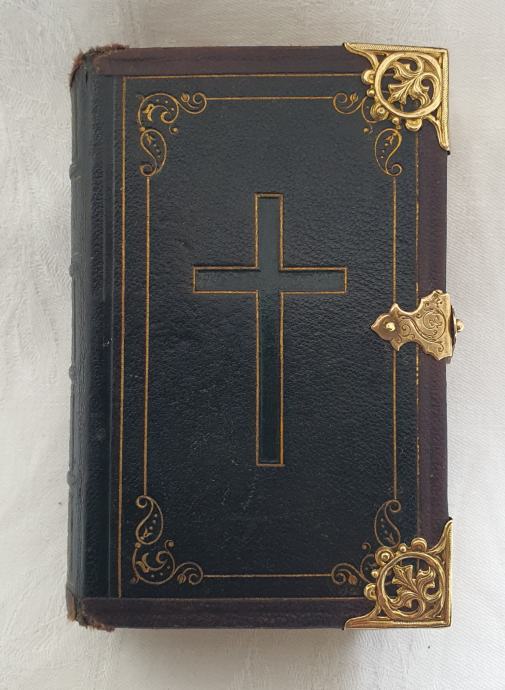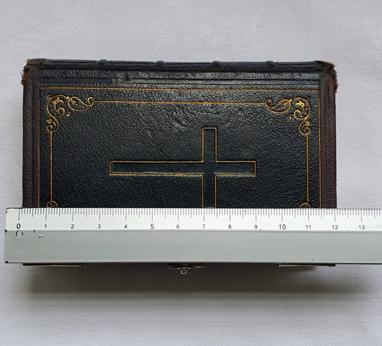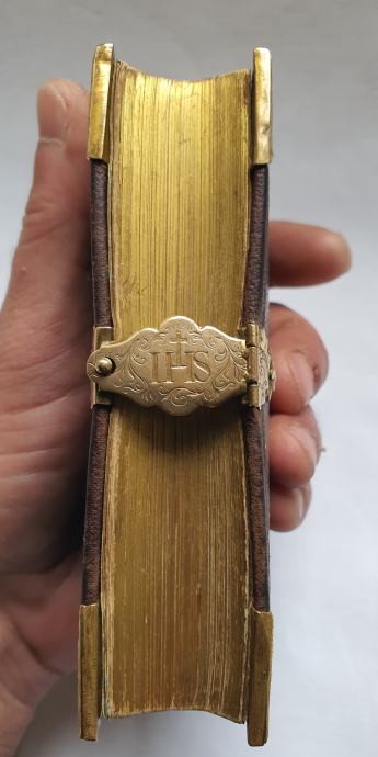 Krasan francuski molitvenik u izvrsnom stanju bogato ukrasen pozlaćenim mesinganim rubnim aplikacijama pozlaćenim listovima zlatotisak vrijeme nastanka prav polovina 19.st sa 640 stranjca dimenzjja 8,5cm x 12 cm x 3,5cm koza i zlatotisak stanje izvrsno.