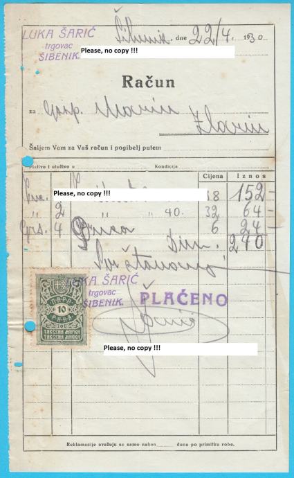 Stari originalni račun šibenskog trgovca Luke Šarića poslan 1930. godine u Zlarin tamošnjem trgovcu Gosp. Marin.