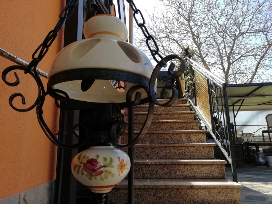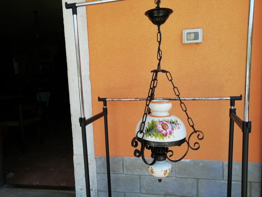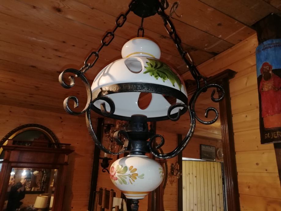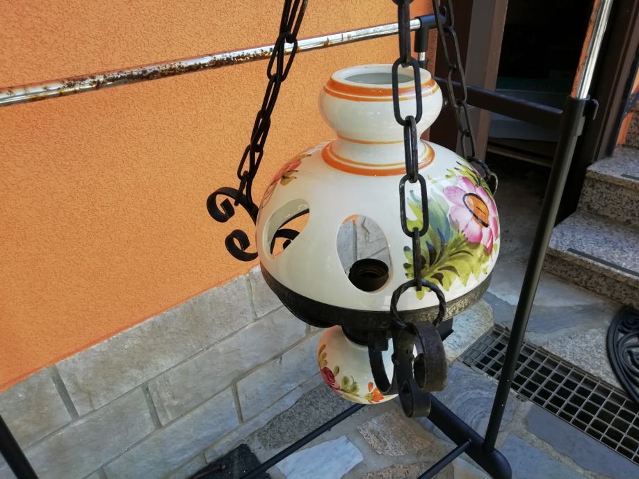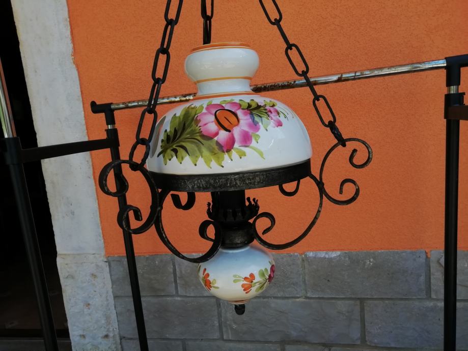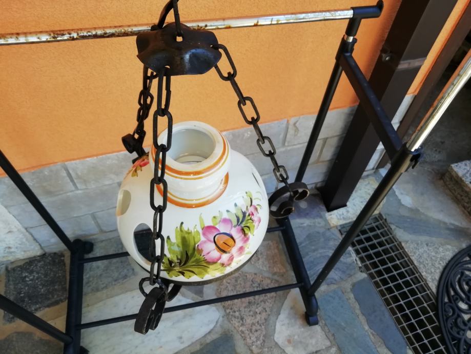 Viseci luster kovano željezo i ručno oslikano keramika Bassano. Visina lustera: do lanca 50 cm, a 80 cm sa cijelim lancem.