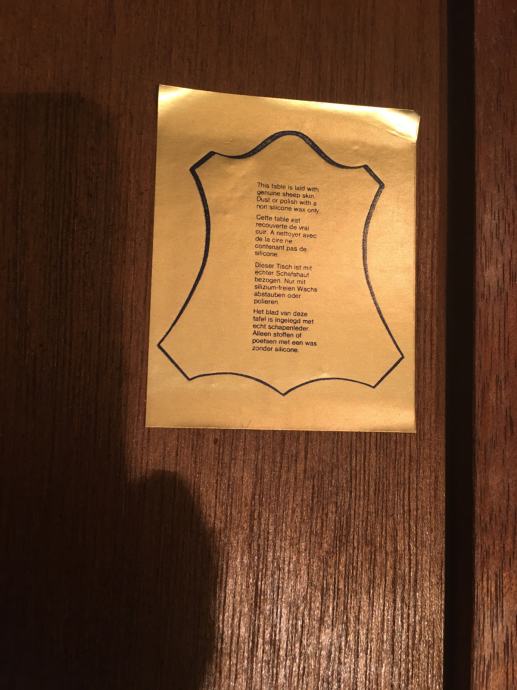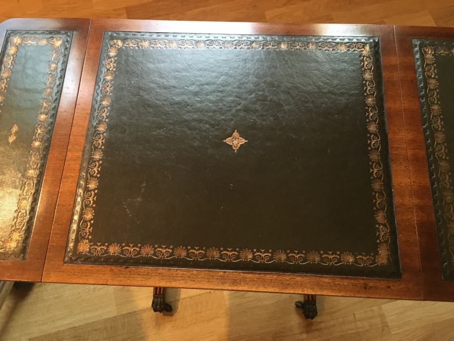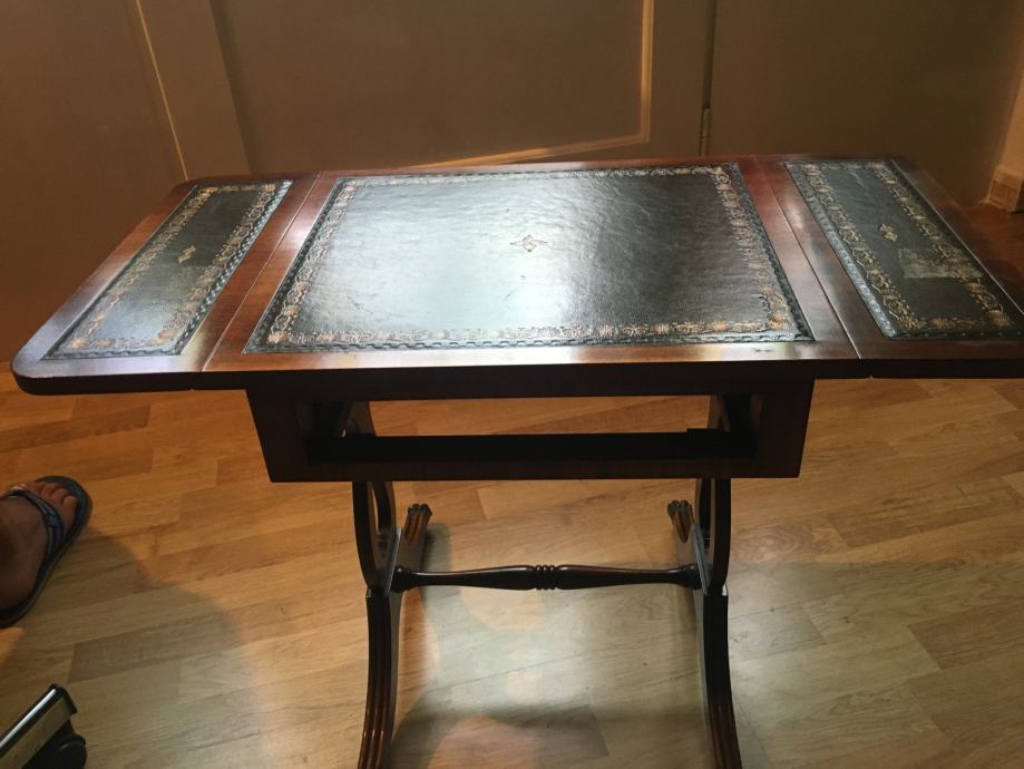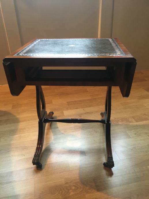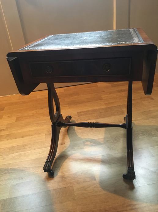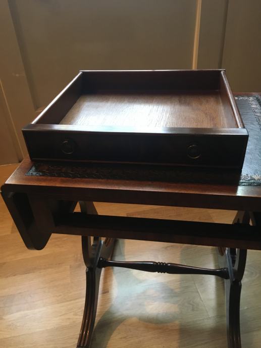 Mahagoni stolić, može se proširiti na oboje strane, umetnuta koza i zlatni umeci, jedna ladica, stol stoji na četri kotača, prekrasni, vrhunski rad iz sredine prošlog stoljeca.
