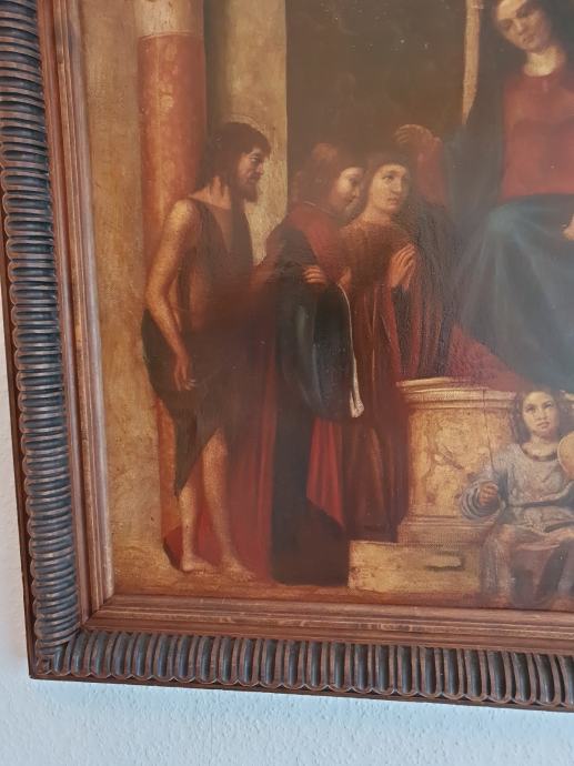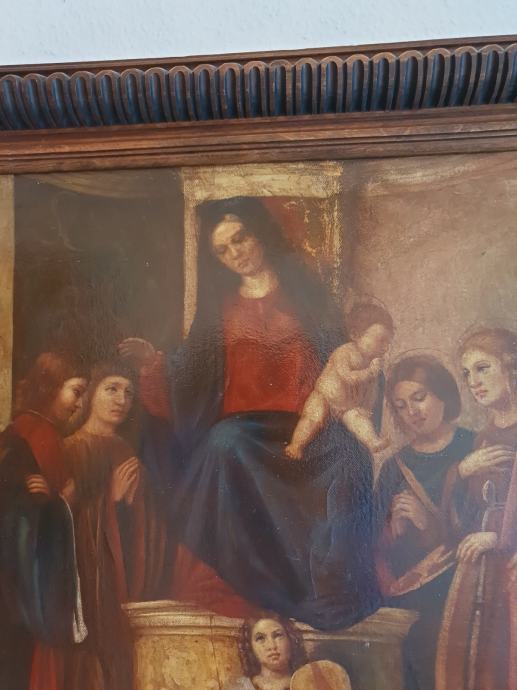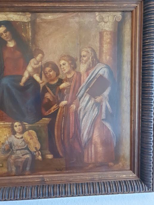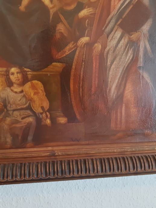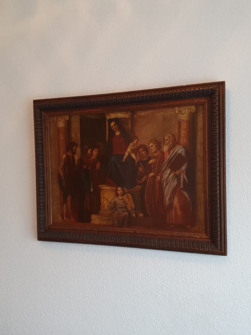 Marija s Isusom,ulje na platnu.Velićina slike 70 X 50 cm,velićina okvira (rezbareni Orah) 84 X 64 cm., signirano AW ,