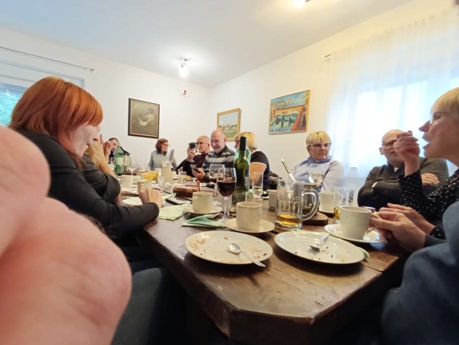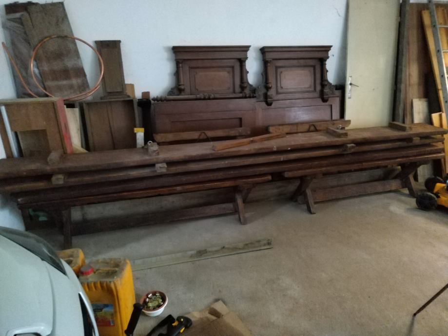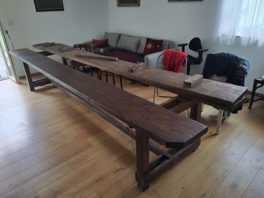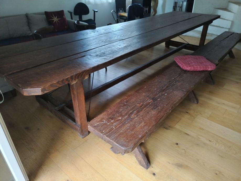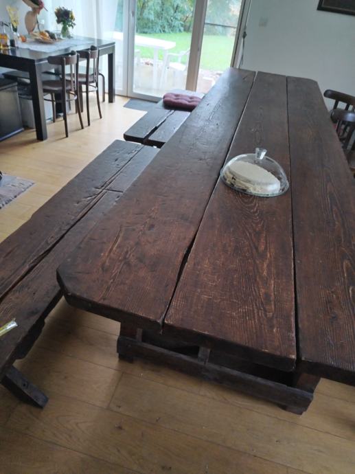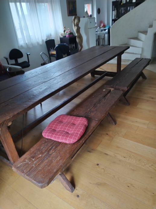 Prodajem masivni stol za 16-18 osoba (možda i do 20 osoba) i dvije drvene klupe. Dimenzije stola su 400x100x75 cm. Stol je izrađen od masivnog drva i potpuno je demontažan. Napravljen je 2010 godine i služio je prilikom gradnje kuće, za rođendane, vjenčanja, krstitke, itd. Jedna osoba ga može prenjeti gdje god treba te ga jedna osoba može i lako sklopiti. (bolje je da to rade dvije osobe). Rastavljen stol stane na dvije klupe koje su također u cijeni. Kada je montiran 2 osobe ga lako miču unutar prostora gdje se nalazi. (Ili jedna osoba, ali mora micati prvo jedan pa onda drugi kraj stola). Stol je izuzetno čvrst (možete plesat na njemu), a dodatnu čvrstoću daju i čelične zatege sa španerima koji se stežu prilikom montaže. Vidljivi su tragovi oštećenja i starosti na daskama što daje lijep rustikalni ton stolu, u stilu, svako oštećenje je - patina (i uspomena na neku feštu). Zaštićen je sadolin lazurom (u više namaza) te ispoliran voskom i zaglađen finim brusnim papirom. Uglavnom, dosta dojmljiv i funkcionalan stol.