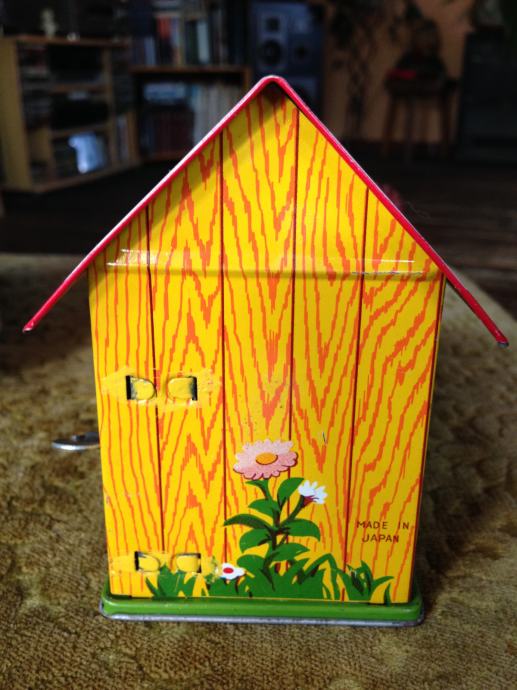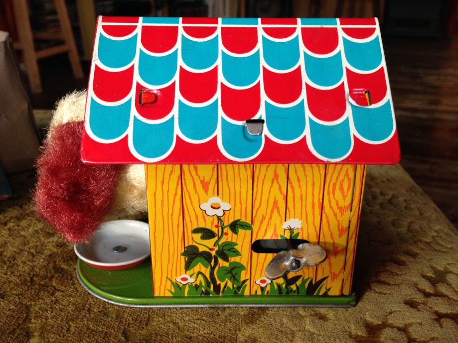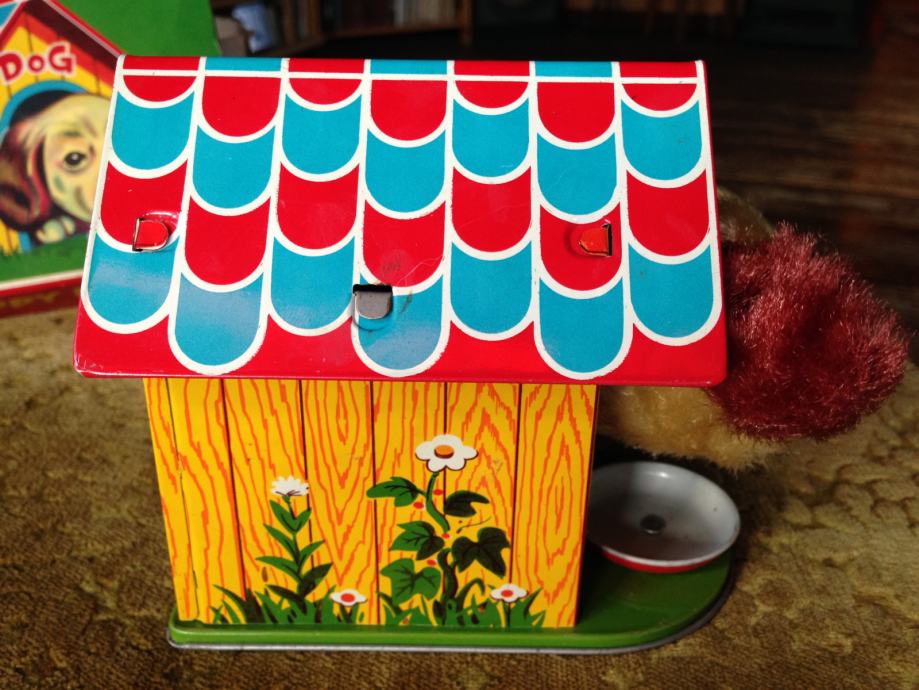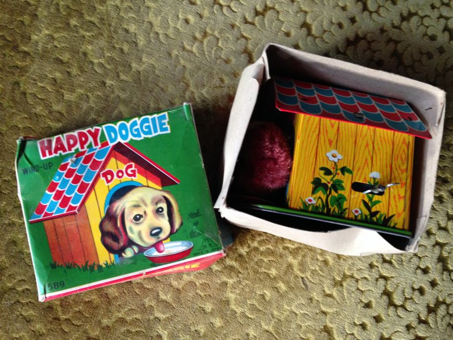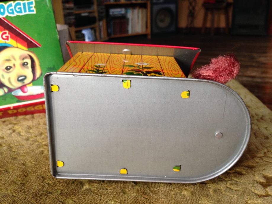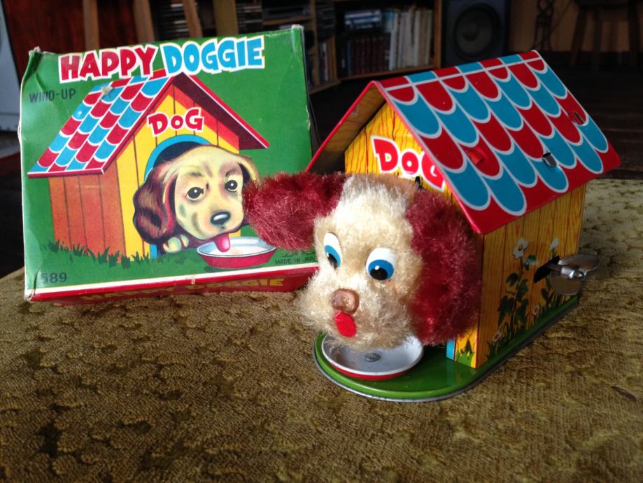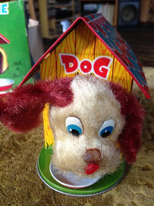 Happy Doggie, made in Japan, iz 60-ih godina. U odličnom je stanju, kao nova (čini se da se s njom nitko nije igrao), bez ikakvih oštećenja, radi savršeno. Kada se navine, pas jede iz zgjelice, podiže glavu i proizvodi neki zvuk :) I kutija je u super stanju. Dimenzije igračke su otprilike - dužina 12 cm, širina 8 cm, visina 10 cm