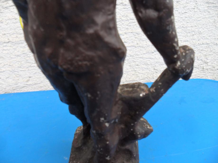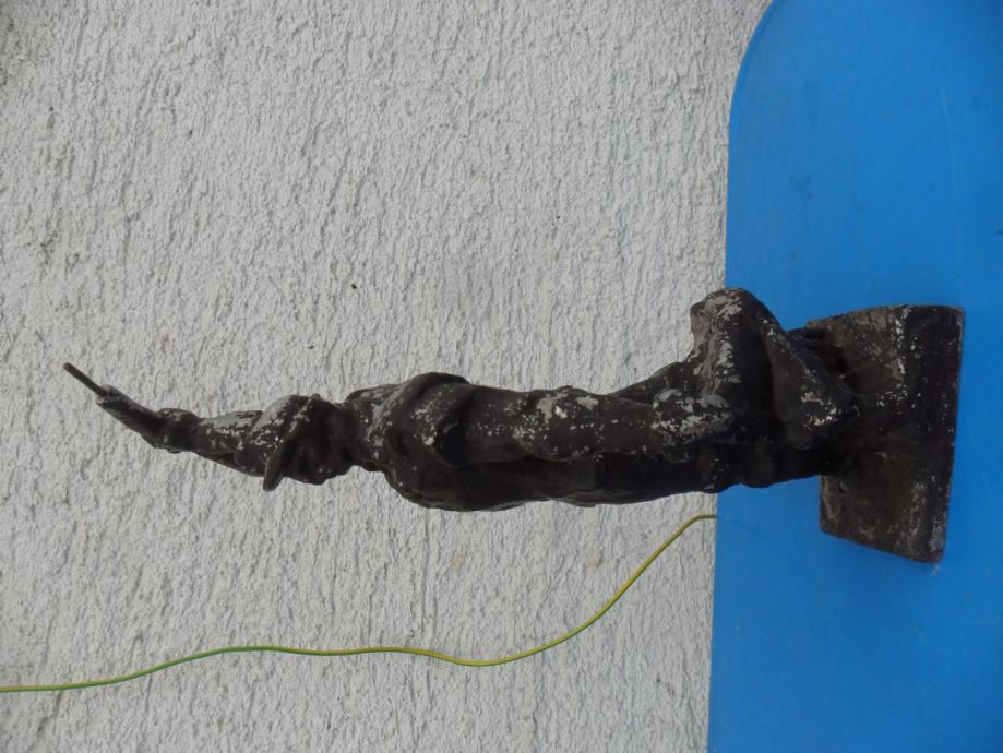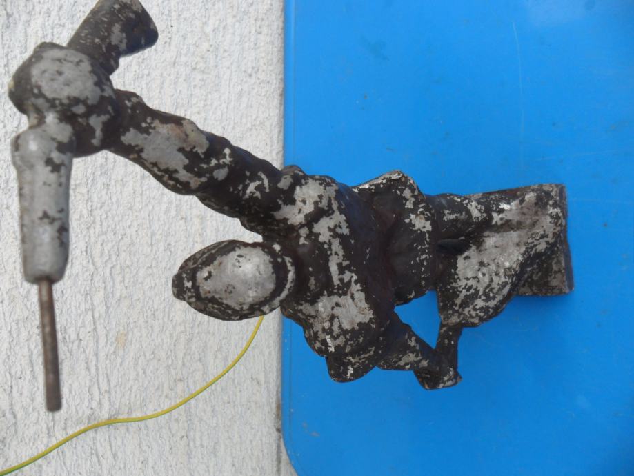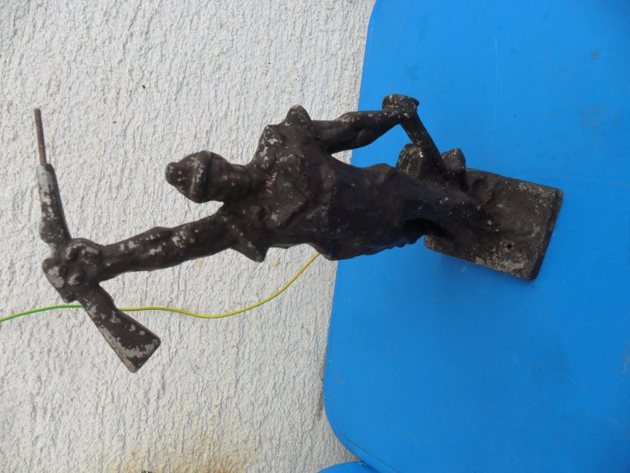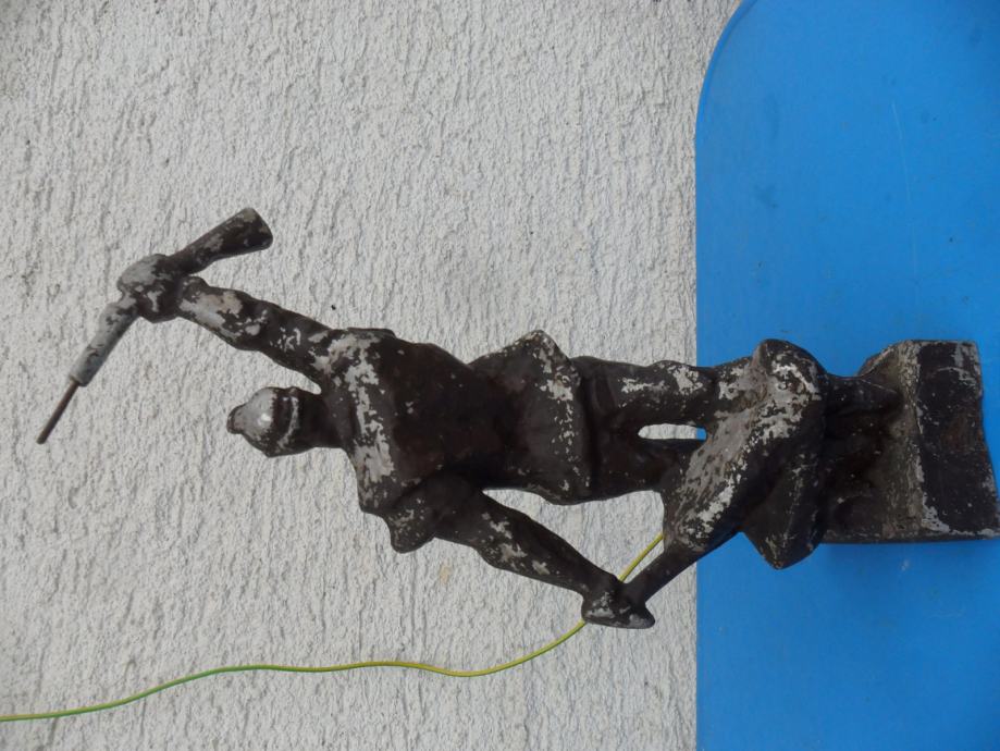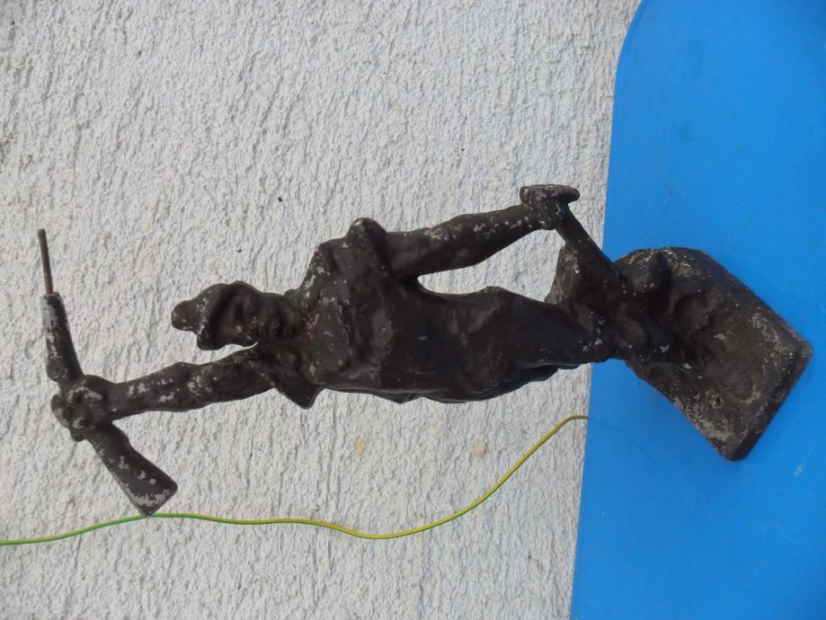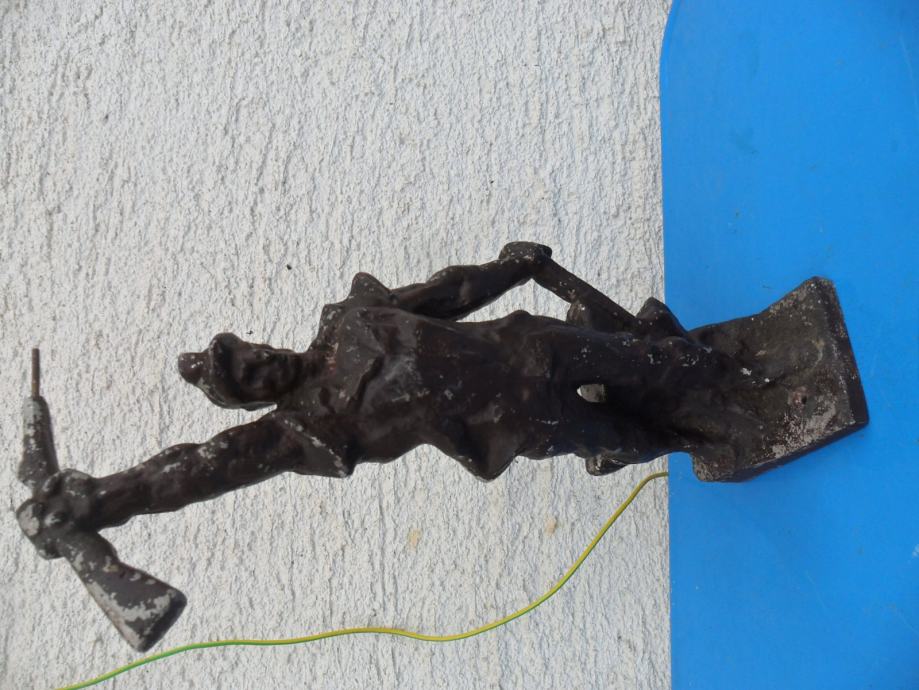 husinski rudar sa oružjem,poznata husinska buna gdje rudari digli ustanak,jako stara skulptura iz privatne zbirke,,bez oštečenja,osim boje,materijal je metal koji ne reagira na magnet,u desnoj ruci drži pušku u lijevoj rudarski kramp,,visina 38cmp,,,,težina 2300gr,,,,,,cijena nije fixna i uvid je u zamjene