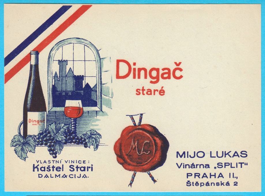 Vrlo lijepa stara originalna predratna vinska etiketa za vino "Dingač" u Vinariji "Split" Kaštelanina Mije Lukasa u Pragu (Češka Republika).