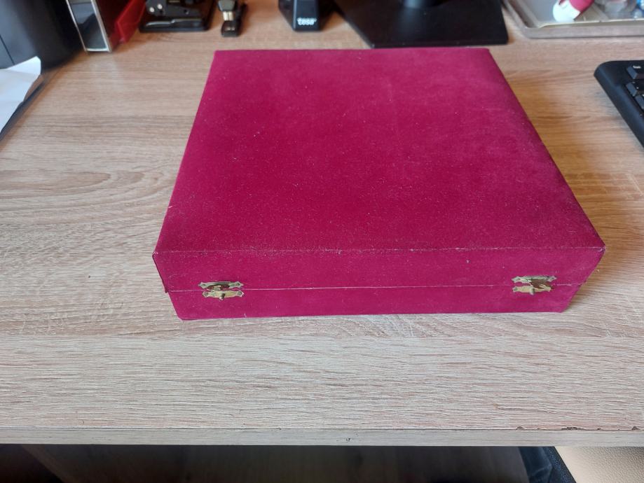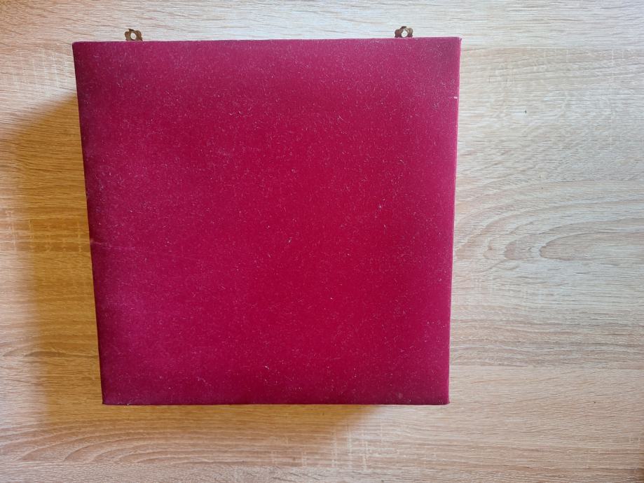Kutija i ploča su presvučene baršunastim materijalom (crveno-bordo).