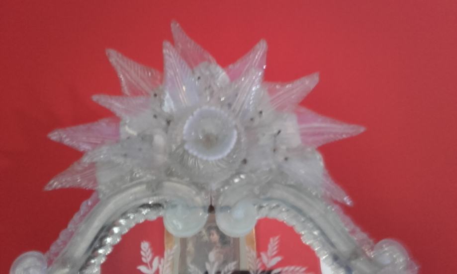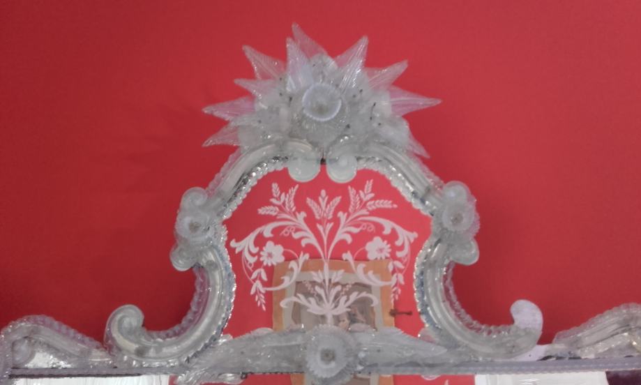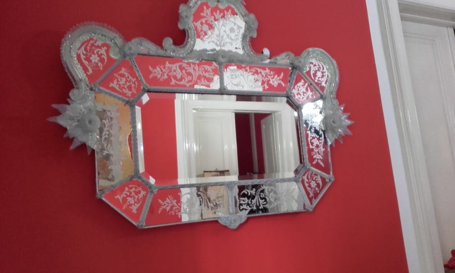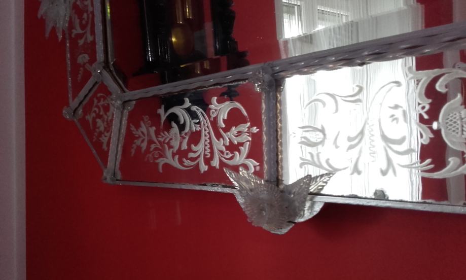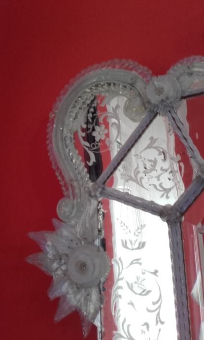 Autentično venecijansko MURANO STIL ogledalo s brušenim ukrasima na staklu i s monokromatskim staklenim listićima i cvjetovima, izvorno stanje, veličina cca 120x100cm. Ogledalo je jako teško (drvena baza) i visi na špagama koje su s stražnje strane. Kupljeno je zajedno sa stanom u kući izgrađenoj 1902. godine što je približno i godina proizvodnje špigla. Vrlo rijetka prilika za nabavku vrlo rijetkog gospodskog komada "iz vremena".