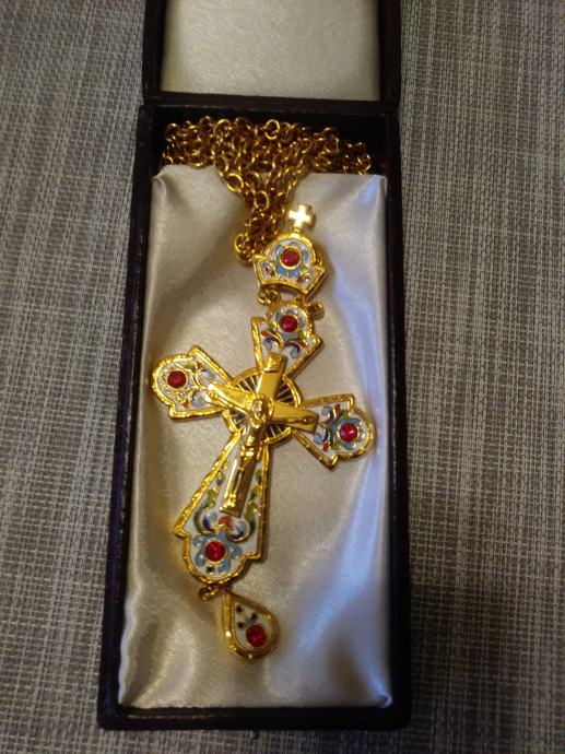 Svećenički pozlaćeni križ, emajlirani s pravim rubinima, tvornički žig/klejmo crkvenih umjetnina. Izvanredan primjerak za kolekcionare. Vrijednost će s godinama samo porasti! Uvoz.