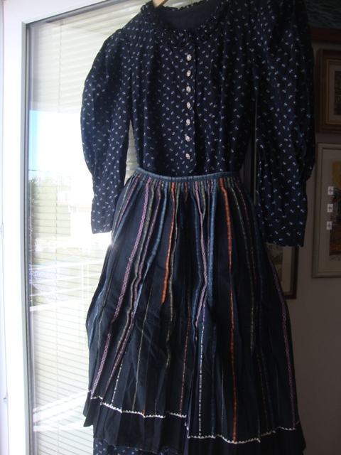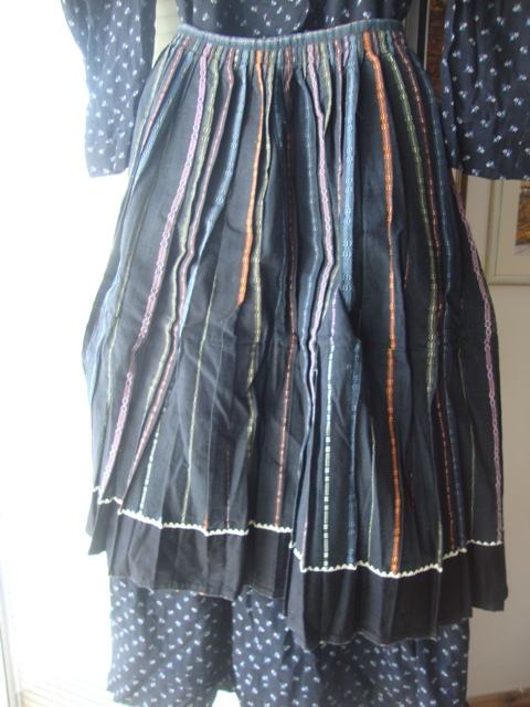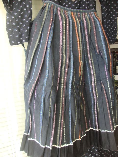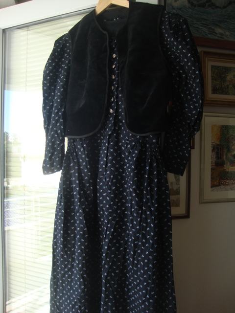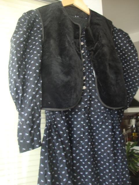 Veličina je otprilike 38 (M) jer evo mjera: ramena 40 cm; struk 39 cm: od struka do dna suknja = 86 cm; . Haljina je kvalitetno šivana, NOVA je. Gornji dio je podstavljen, oko vrata ukrašen volanom od iste tkanine, srebrnih dugmića. Pregača je stara, naslijeđena, tkana a prsluk je industrijski, kupljen (pliš, piše na njemu da je broj 46 ali je manji tj. za M... Pišem rabljeno radi pregače...
