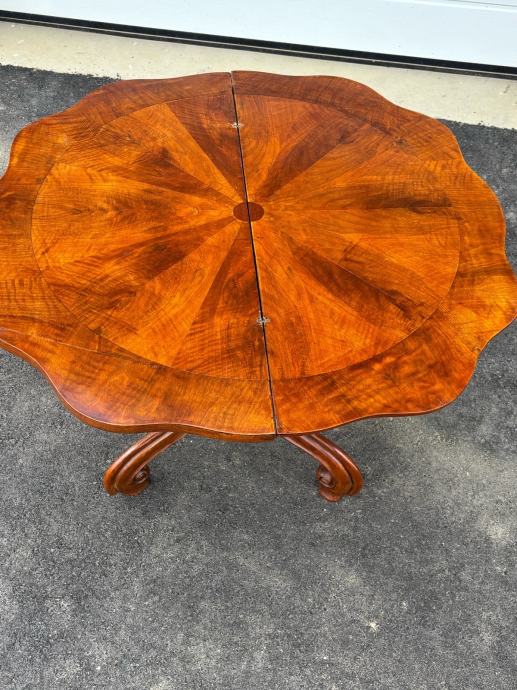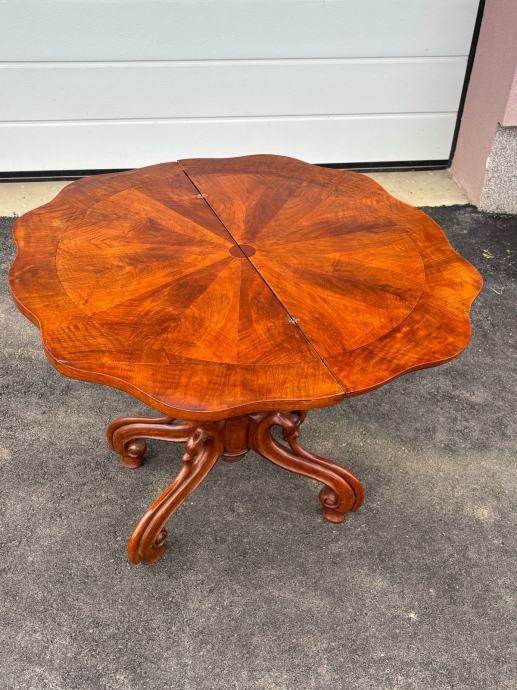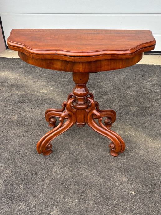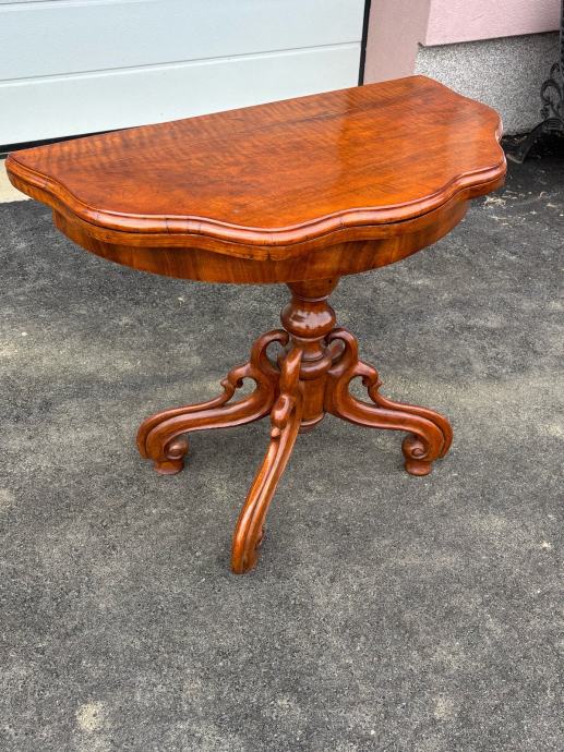 Konzola napravljena 1870-1880godine u vrlo dobrom stanju. Nigice su krasno formirane od bukovog drva, a sarg i ploca su furnirane orahovim furnirom.