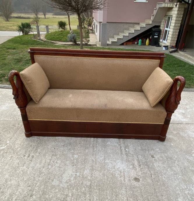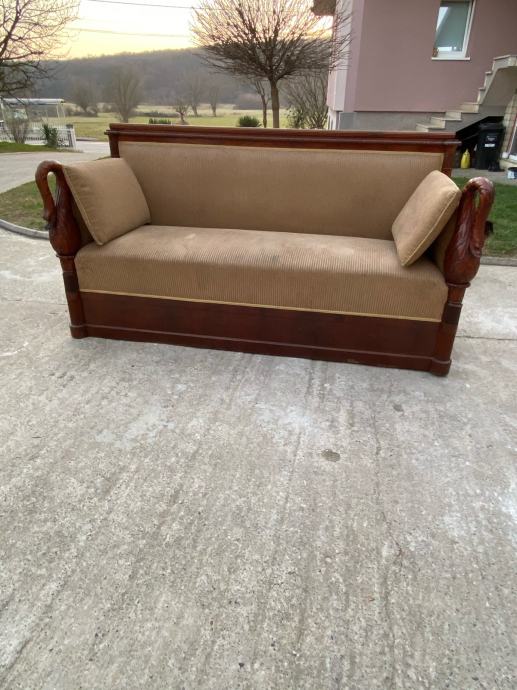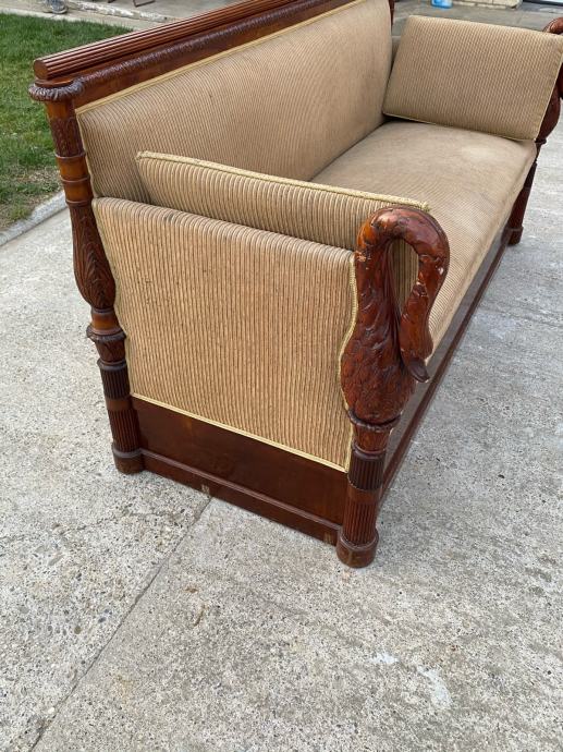 Neoempirska sofa u vrlo dobrom stanju sa prekrasnim rezbarijama u mahagoniju. Unutarnji tapecirung u odlicnom stanju(potrebno je samo presvuc zavrsni)