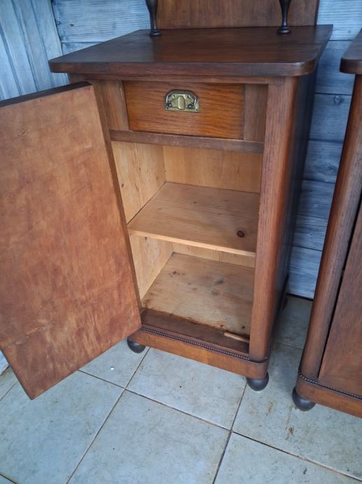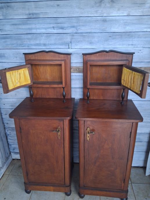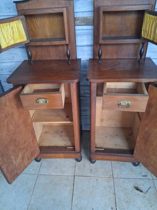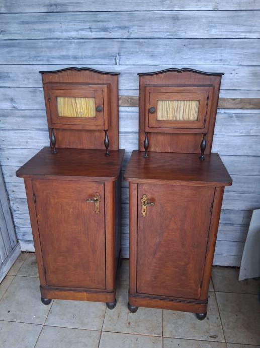 Starinski nocni ormarici 2 komada u odličnom stanju. Dimenzije ormarica: visina 80cm, duzina 43 i dubina 37 cm. Visina cijelog ormarica sa gornjim dijelom 120 cm.