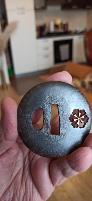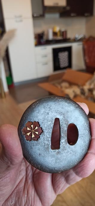 Originalna željezna tsuba okruglog (maru-gata) oblika, ukrašena heraldičkim sakura (trešnja) monom u kombinaciji zlata i tamno patiniranog metala. Dekor je koncentriran i elegantan, dok ostatak ploče ostaje suzdržan, što daje vrlo skladan i profinjen izgled.