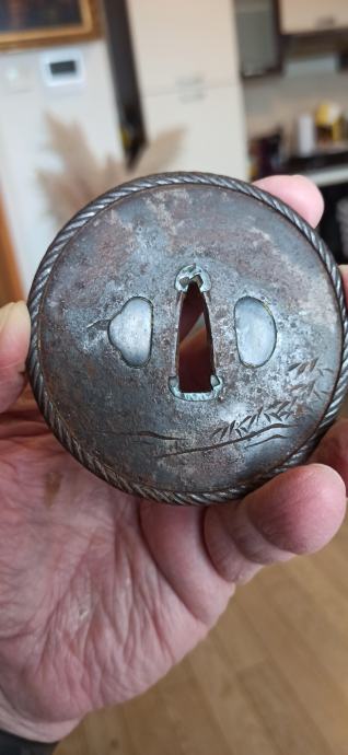 Originalna velika željezna tsuba okruglog oblika, s dekorativnim pletenim (rope) rubom. Površina je ukrašena suptilnim biljnim i pejzažnim linijama izvedenima u plitkom graviranju. Sekigane i bočni umetci izrađeni su od srebra.