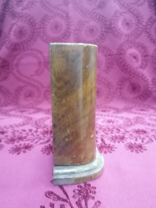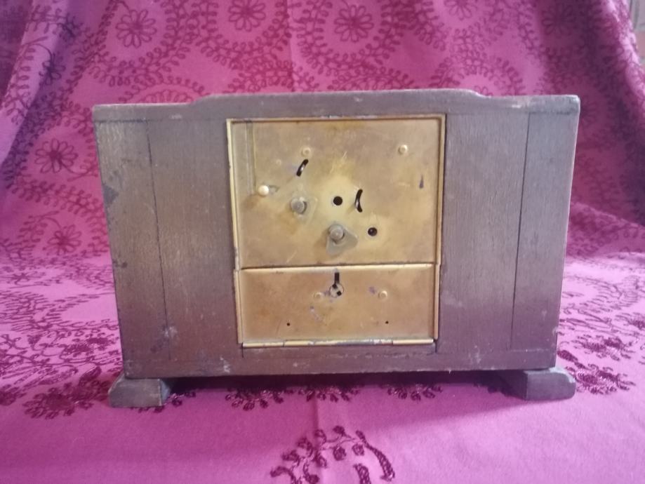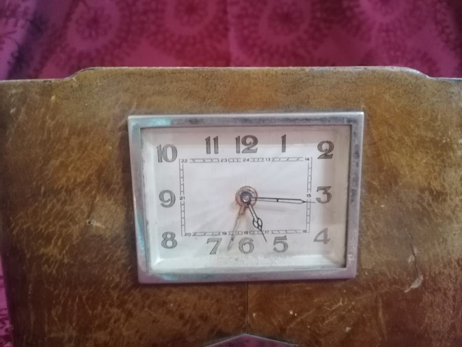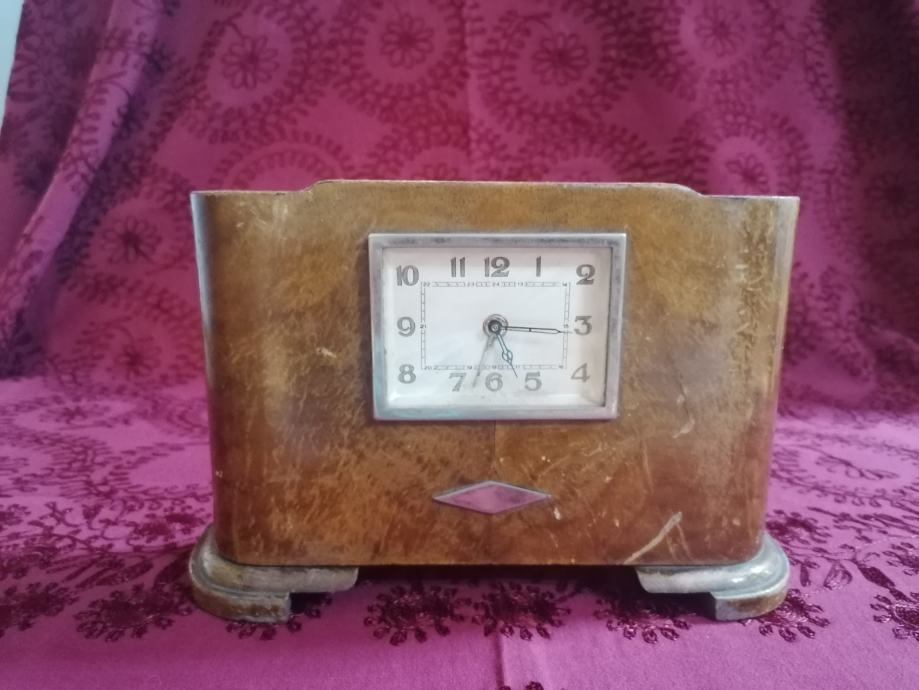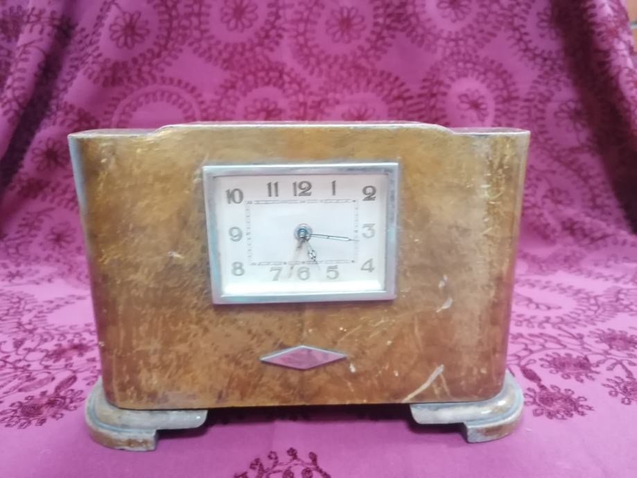 Stolni drveni sat iz doba art deco-a. Ispravan. Sa stražnje strane fale dva štifta za pomicanje kazaljki, što se lako naće zamjenske. Dimenzije 21x15x6 cm. Kolekcionarski primjerak. Dobijete predmet sa slika.