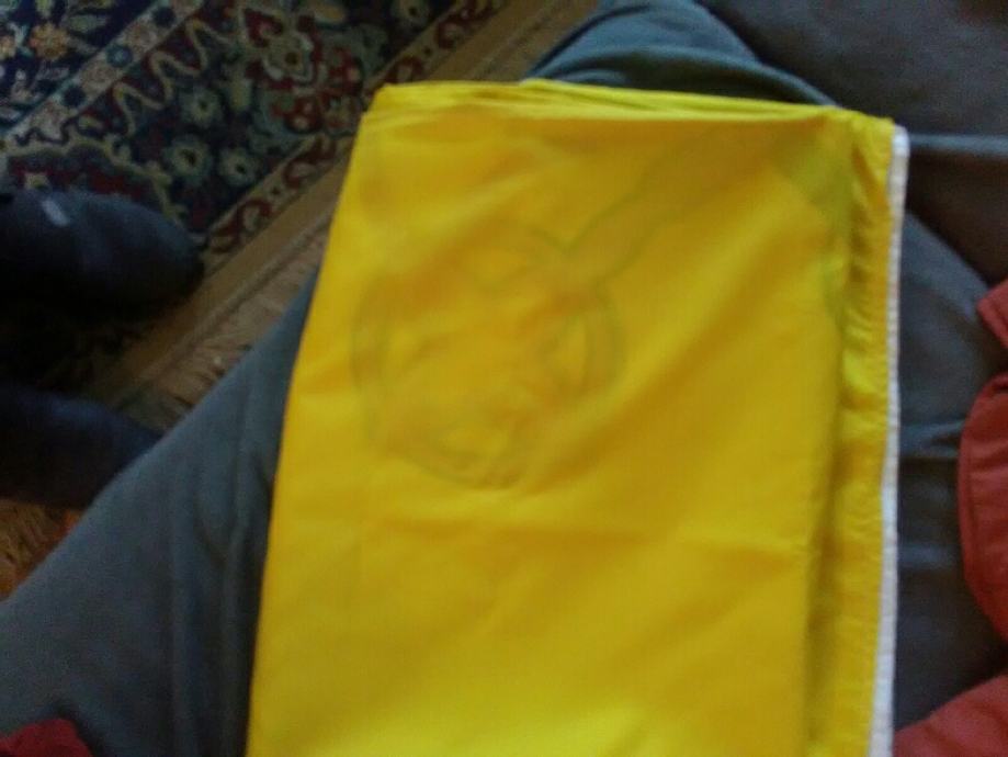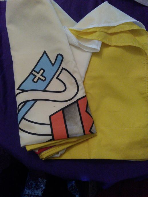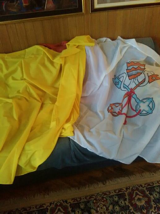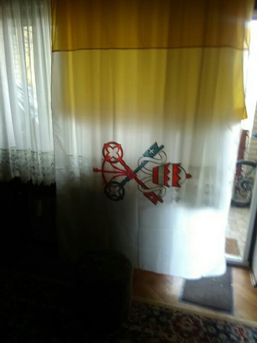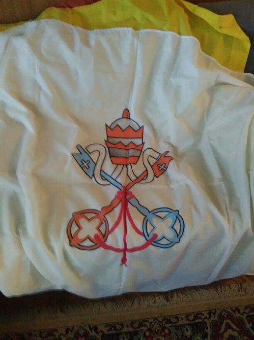 Velika zastava (150x340cm)povodom dolaska Pape IvanaPavla ll u Osijek 07. 03. 2003godine.Obilježava mjesto i prostor u kojem boravi Papa.