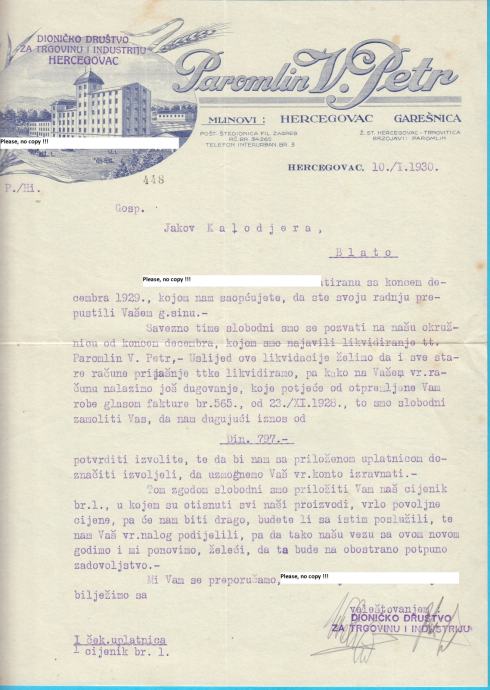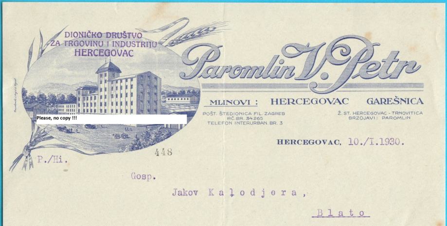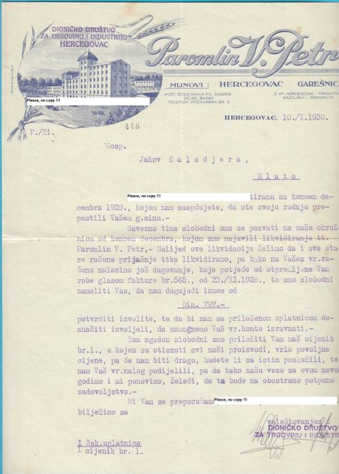 PAROMLIN - V. PETR mlinovi: HERCEGOVAC - GAREŠNICA memorandum iz 1930.
