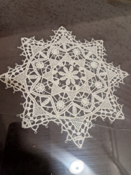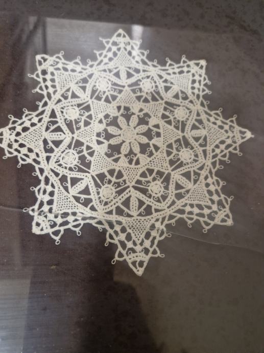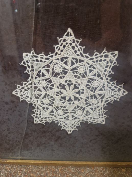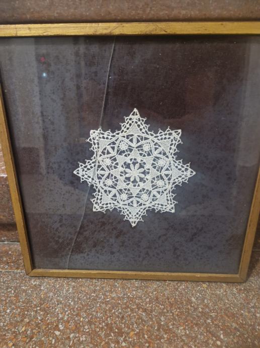 Čipka oko 15 x 15 cm, okvir oko 31 x 31 cm...staklo na okviru je puknuto i treba ga promijeniti ili kompletno izvaditi čipku da nije u okviru, tko kako želi. Poruke na whatsapp...