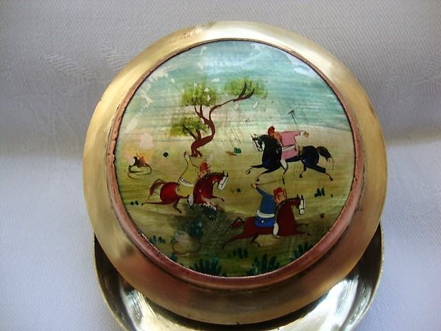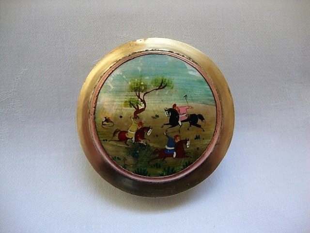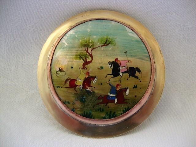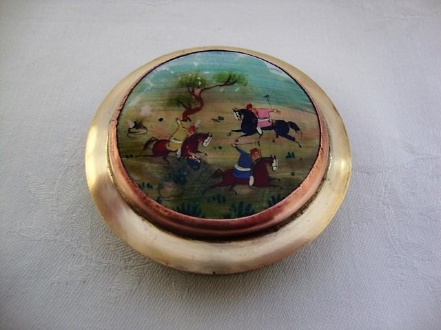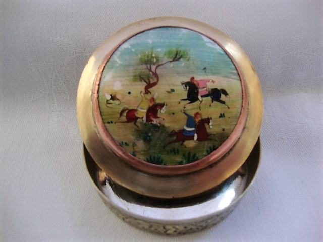 Antikna Perzijska kutija za puder sa kraja 19. stoljeća emajl boja ručno oslikana na sedefu, motiv lova