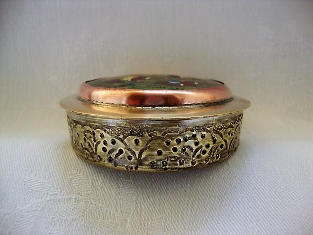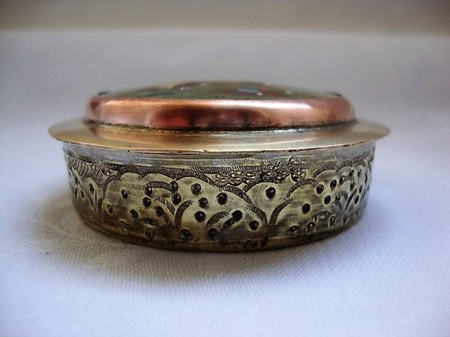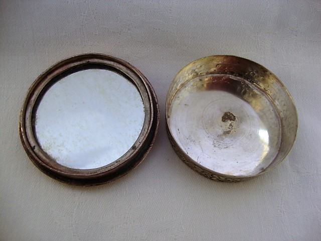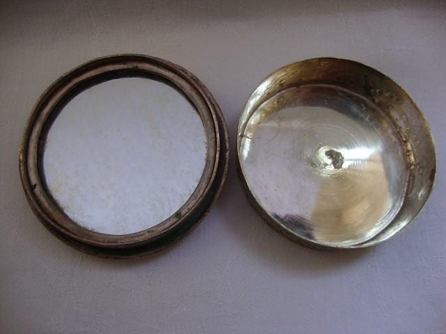 Materijal posrebreni mesing, reljefno ručno kovan ,ogledalo unutar na poklopcu , promjer 6.5 cm
