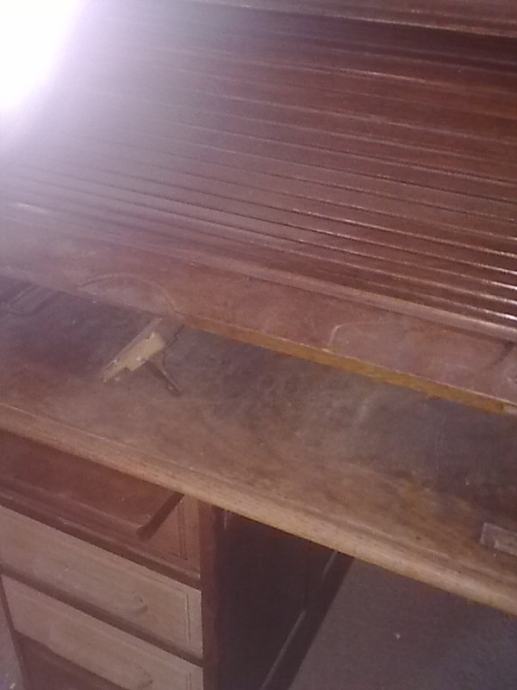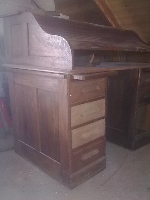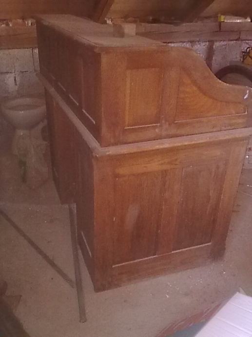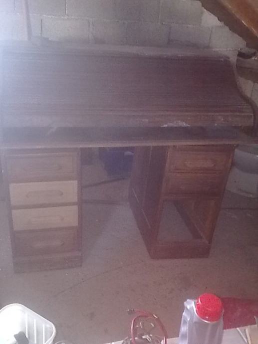stol pisaći, hrastov, masivan, starinski,sa puno ladica, ima roletu koja se izvlači i pokriva cijeli pisaći prostor,iznad ladica su dvije manje ploče koje se izvlače, prilikom transporta , stol se može rastaviti u tri djela