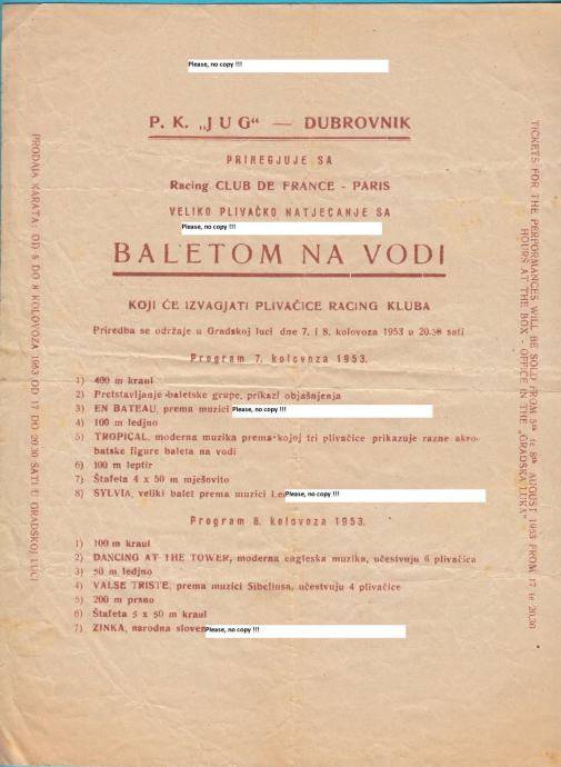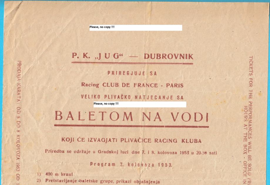 Stari, originalni, vrlo zanimljiv Dubrovački plivački program iz 1953. godine.