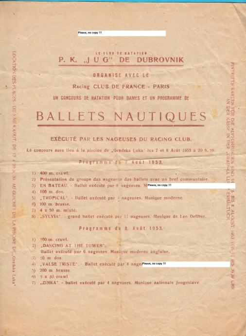 PK JUG DUBROVNIK & RACING CLUB DE FRANCE - BALET NA VODI program 1953