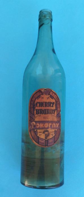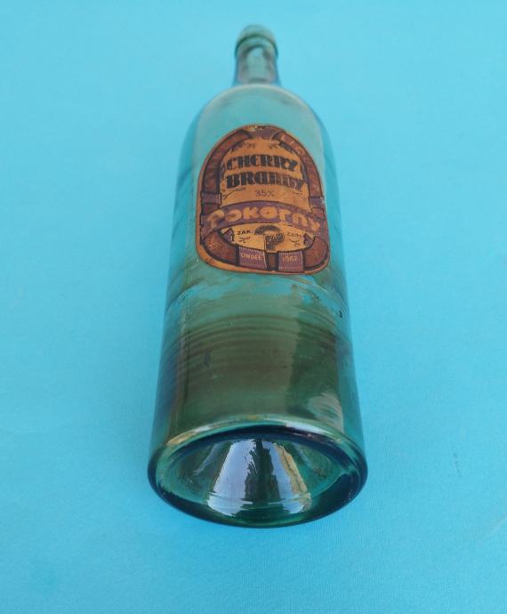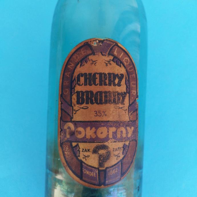 Jako lijepa stara staklena boca likera "Cherry Brandy" poznate zagrebačke tvornice likera "Pokorny" ("Grande Liqueur").