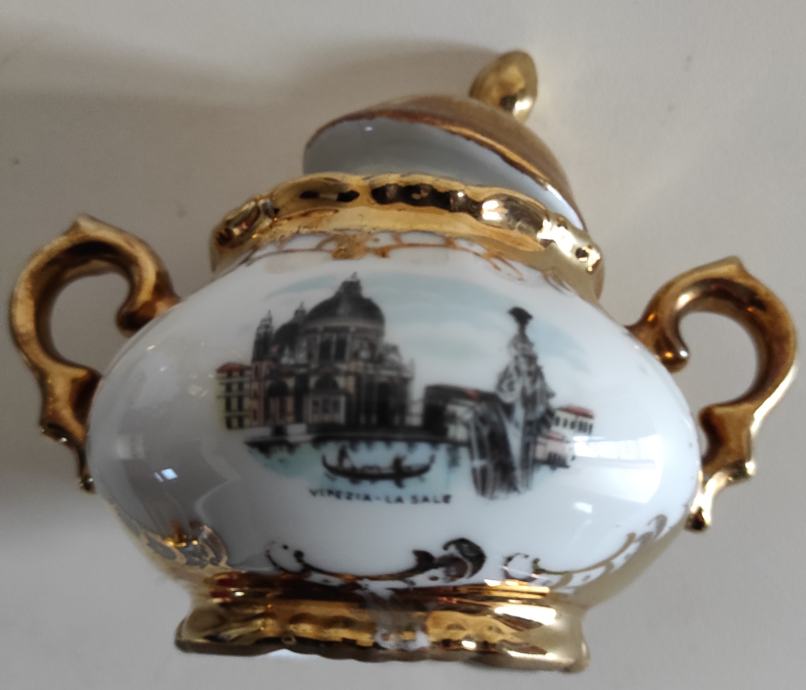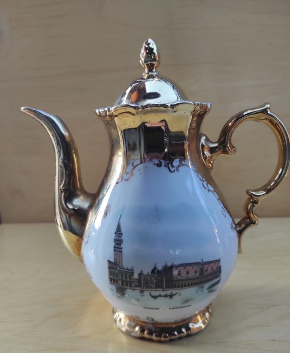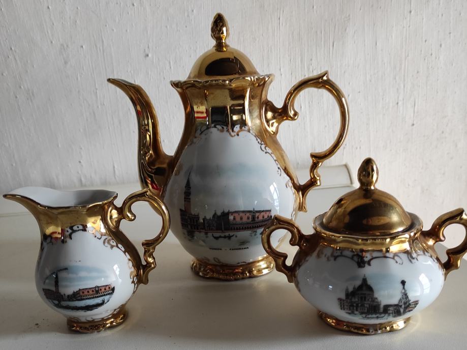 Porculanski pozlaćeni set proizveden u Njemačkoj, sa motivima Venecije, sastoji se od čajnika sa poklopcem, malog vrča za mlijeko i posudice za šečer sa poklopcem na kojoj je rupica promjera 4mm od pada male žličice (vidljivo na slici), obiteljsko nasljeđe, pogodno i za filmske setove, kolekcionare, ljubitelje starina, sve one koji će udahnuti novi "život" ovim stvarima