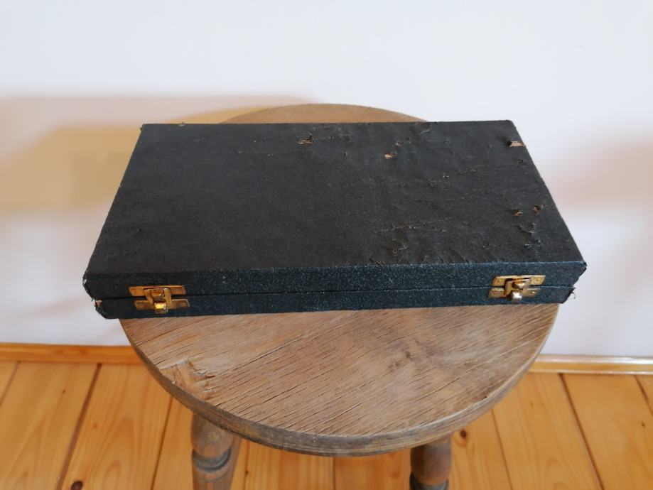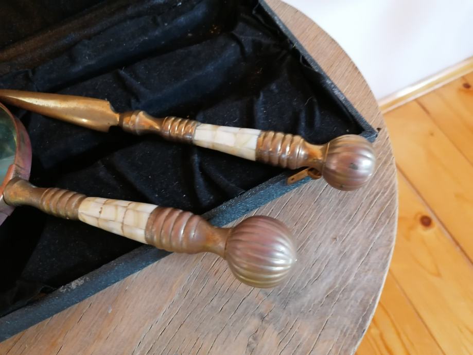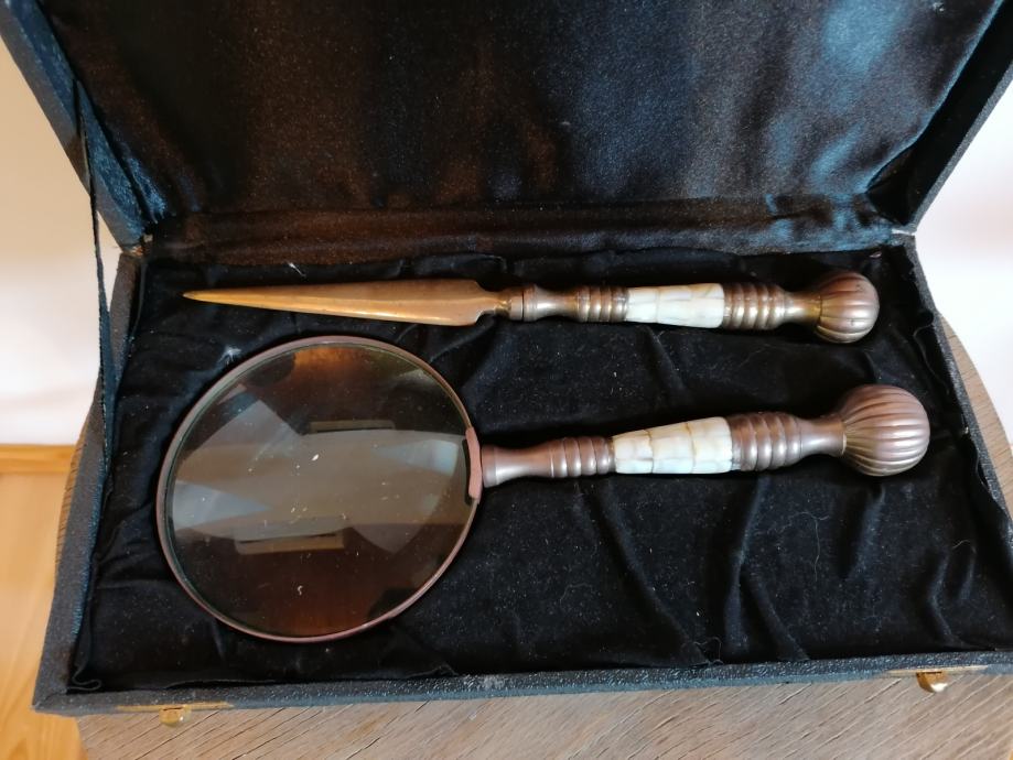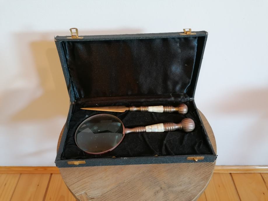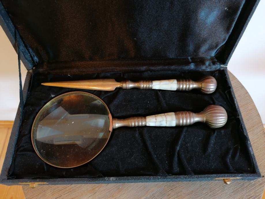 Komplet od velikog masivnog povećala i noža za pisma. Predmeti dolaze iz kuće starog dubrovačkog kapetana. Tijelo od mesinga ili bronze, sa umetcima od sedefa. Duljina 25 cm. Pravi kolekcionarski predmeti. Trajat će cijeli život. Dobijete predmet sa slika.
