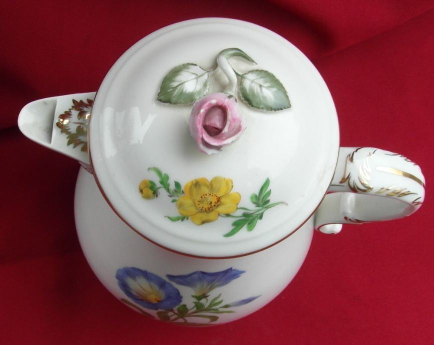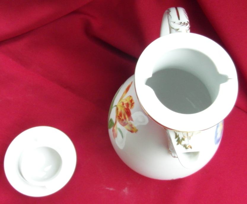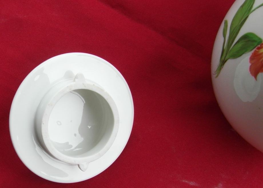 Visina sa poklopcem 27 cm, širina sa ručkom 16 cm. Vrlo dobro stanje, manja krhotina na dnu i manja flekica na poklopcu (jedva vidljivo)