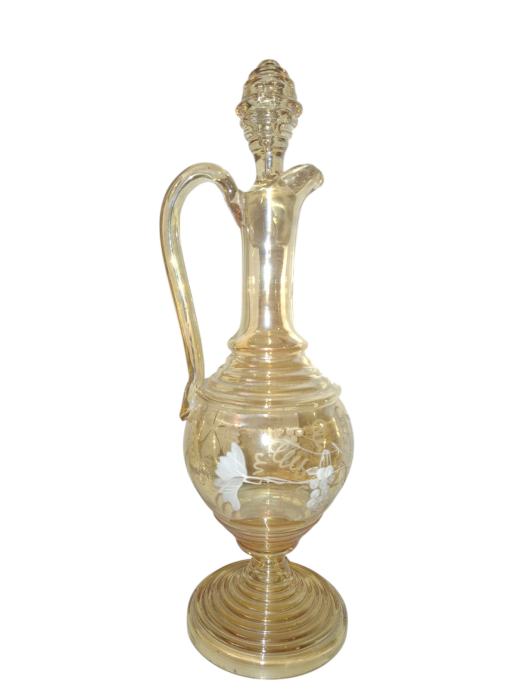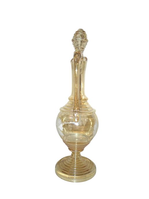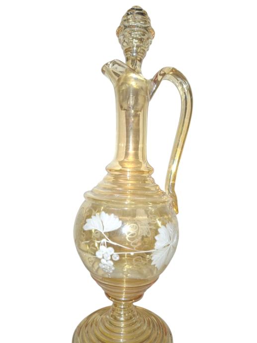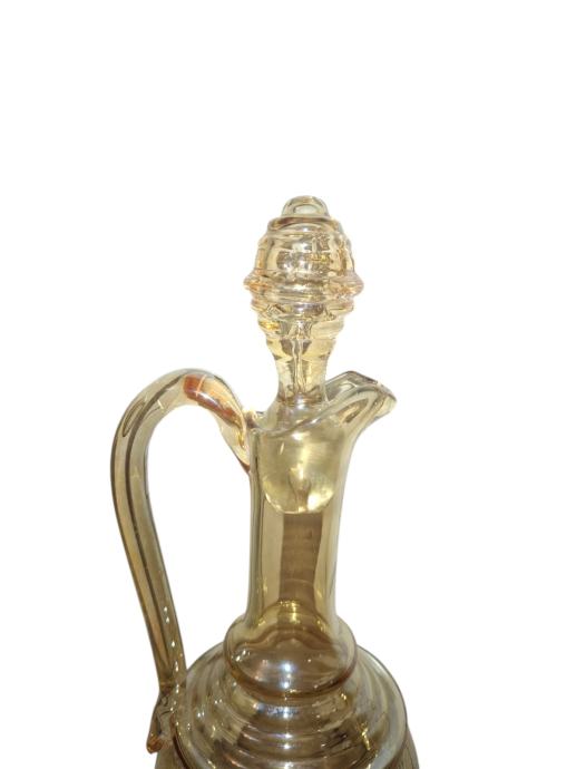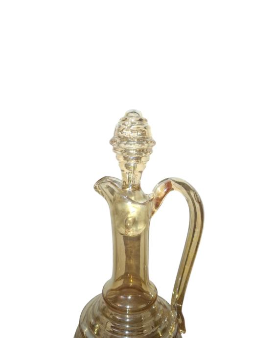 Elegantan, starinski bokal (dekanter) izrađen od tankog stakla u boji jantara.