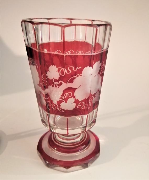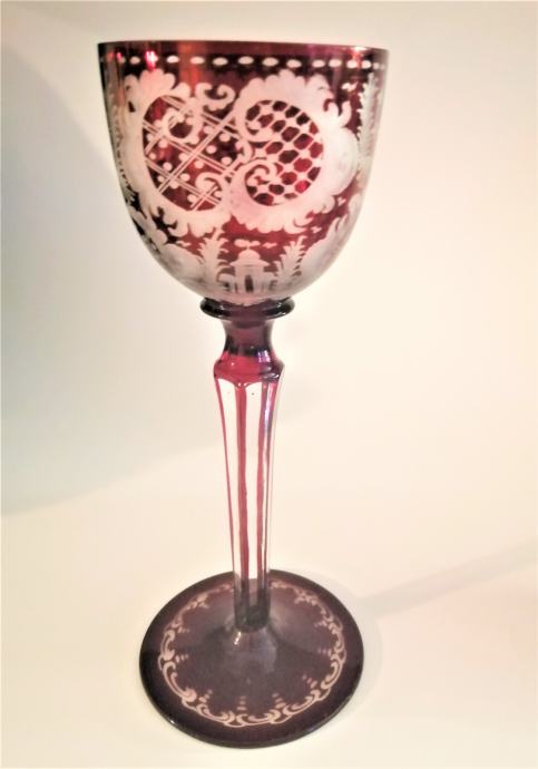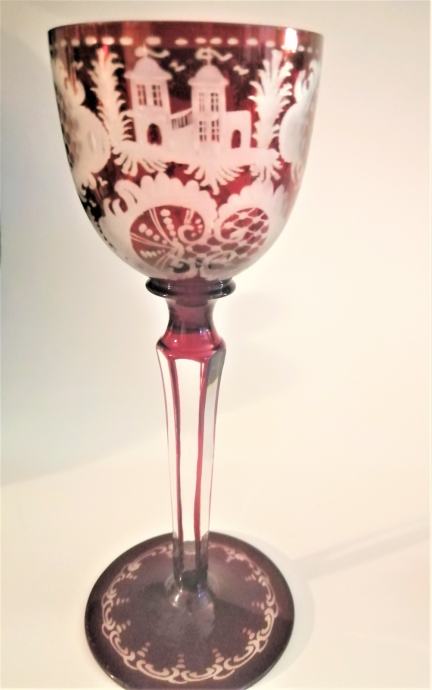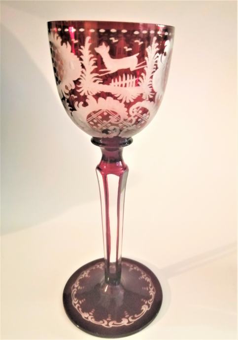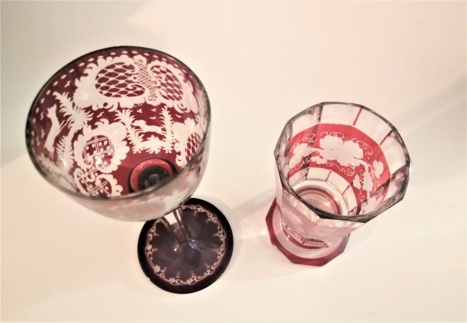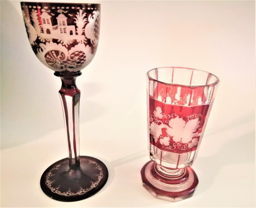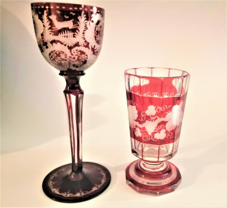 Prekrasna Bohemia umjetnička čaša za vino (visina 19cm, promjer 7cm) i čaša za vodu (visina 13cm, promjer 7cm) iz 19. stoljeća. Ručno puhane i rezane rubin kristalne čaše, jedna s motivom lova s prikazom pasa u krajoliku, a druga s granama vinove loze.