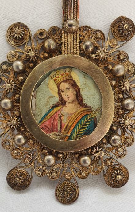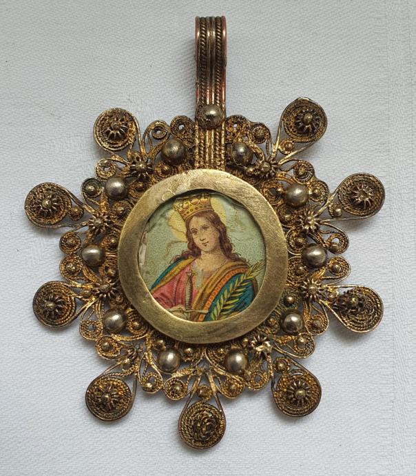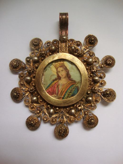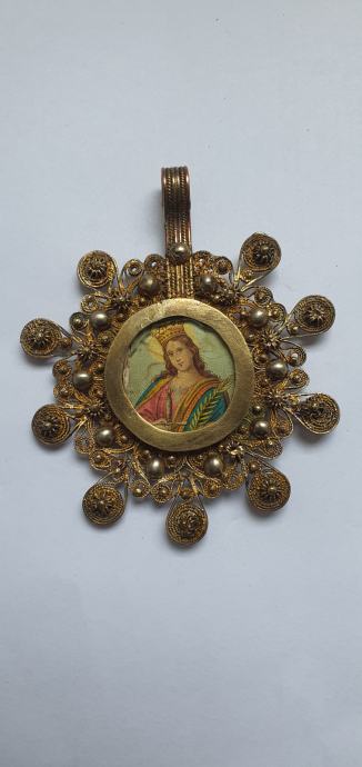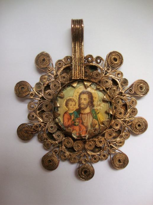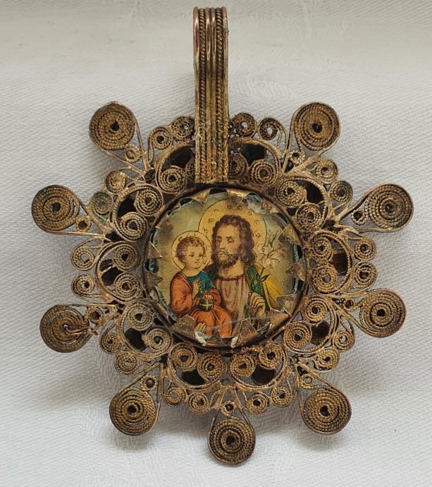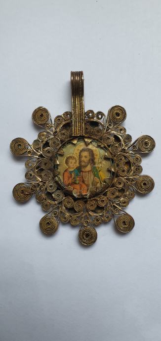 Predivan dalmatinski stari filigranski privjesak rucni rad pozlaćeno srebro tehnika filirgan velik i raskošan ukupna visina sa alkicom 8,4cm ,promjer bez alkice 7 cm jako lipo očuvano