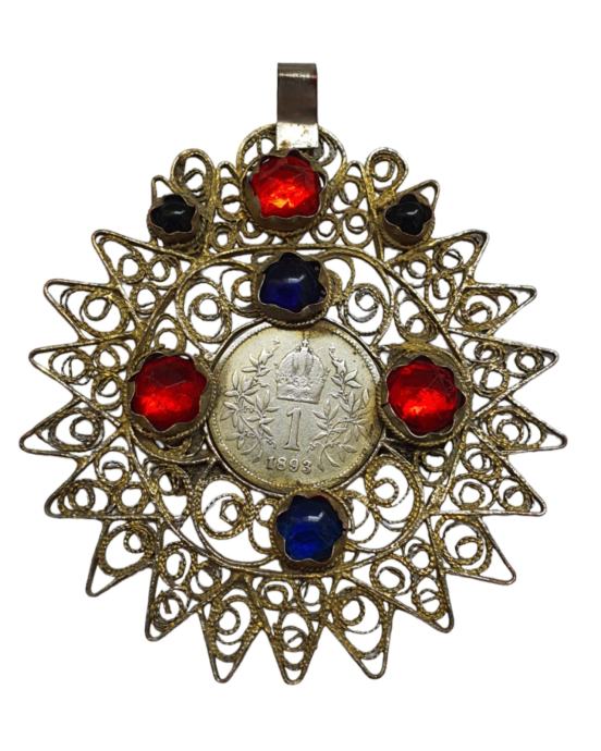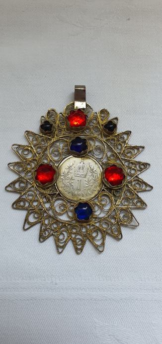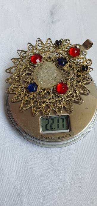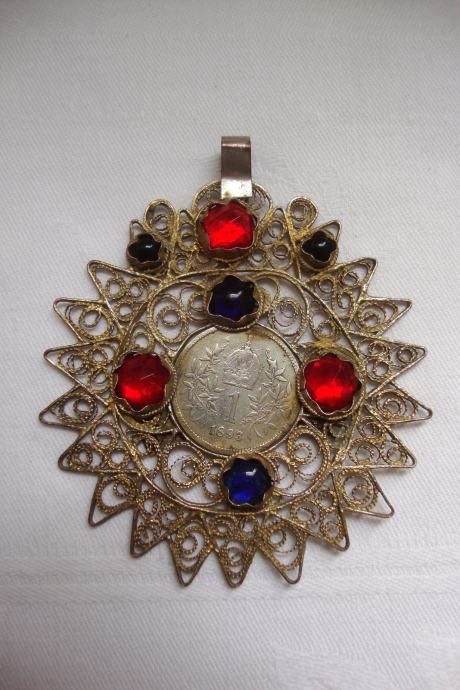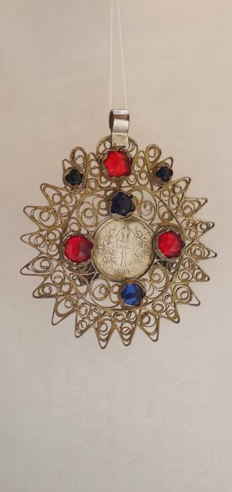 Stari srebrni privjesak ručni rad u tehnici filigran pozlata ukrašeno sa staklenim zrnjem stanje izvrsno rad oko 1893 godine