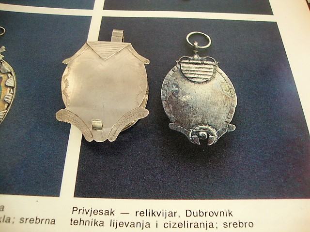 Jedan krasan primjerak Dubrovačkog tradicijskog nakita iz ranog 18.stoljeća rad u srebru rubno ručno ukrašen gravurama znak i daje pripadao višem staležu privjesak ili škapular ujedno relikvijar oblika medaljon koji se otvara i zatvara