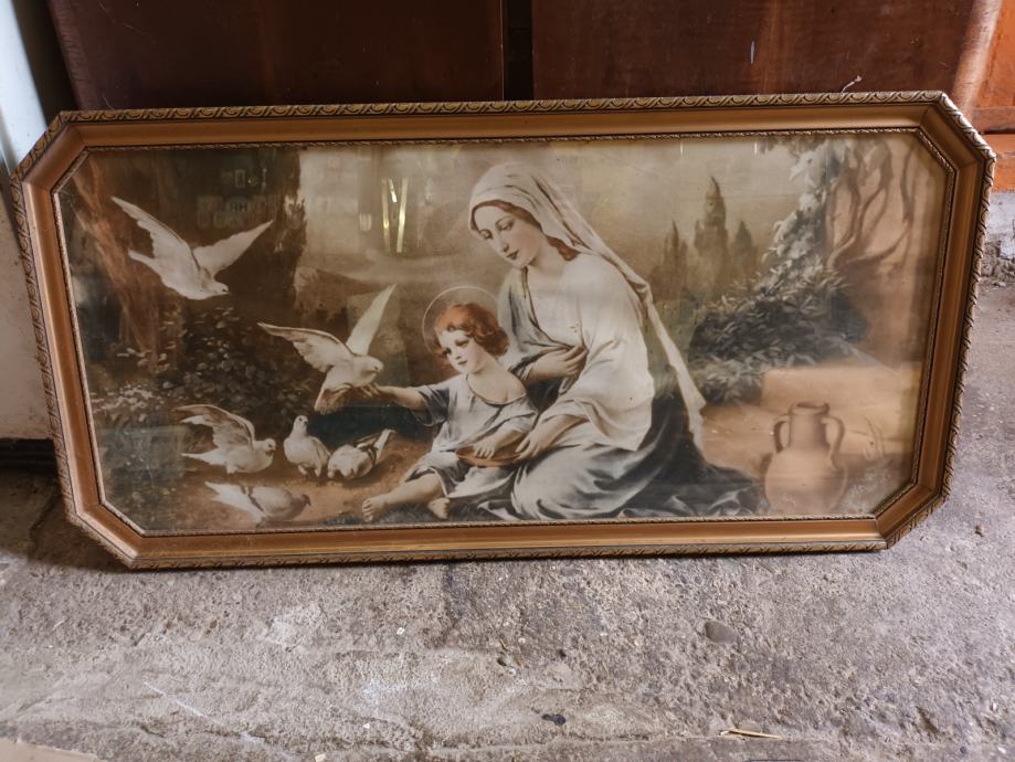 Prodaje se uokvirena i ostakljena vjerska slika stara preko 60 godina u odličnom stanju s motivom Marije i malog Isusa u hranidbi golubova. Izmjere okvira 120 x 60 cm.