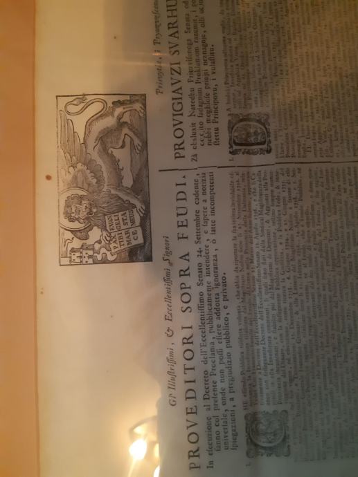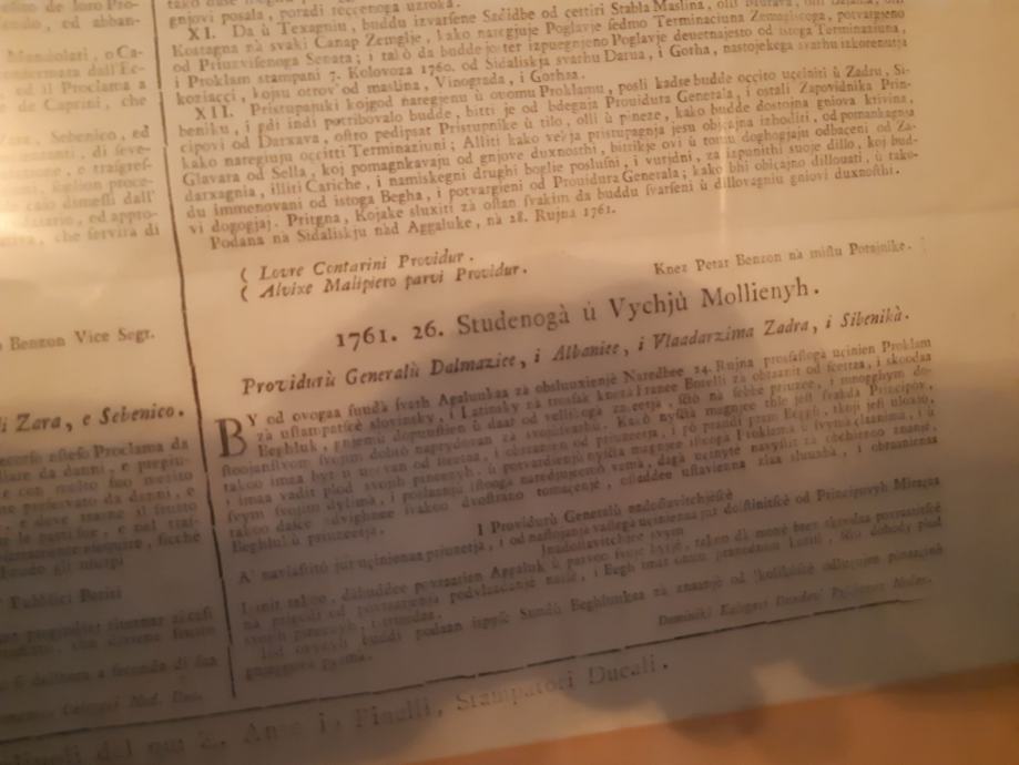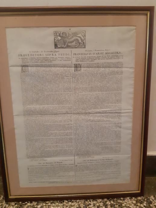 Dvojezični, hrvatsko-talijanski proglas iz 1761. g. vjerojatno u svrhu kakvih feudalnih davanja. Odlično uščuvan i dekorativan. Uramljen u lijepu novu ramu.